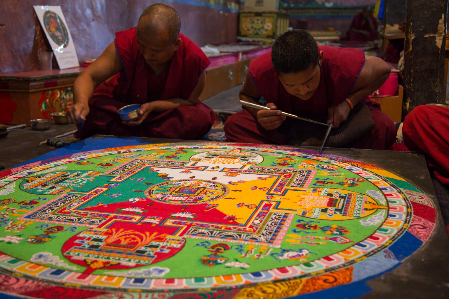 In the afternoon we walk up to the monastery and visit the many temples inside. In one of them a group of monks is making a mandela out of colorful powders. It takes about five monks three days to make this artwork, then after seven days it is destroyed to illustrate the temporary nature of everything. The monastery is beautiful with awesome views down the valley.