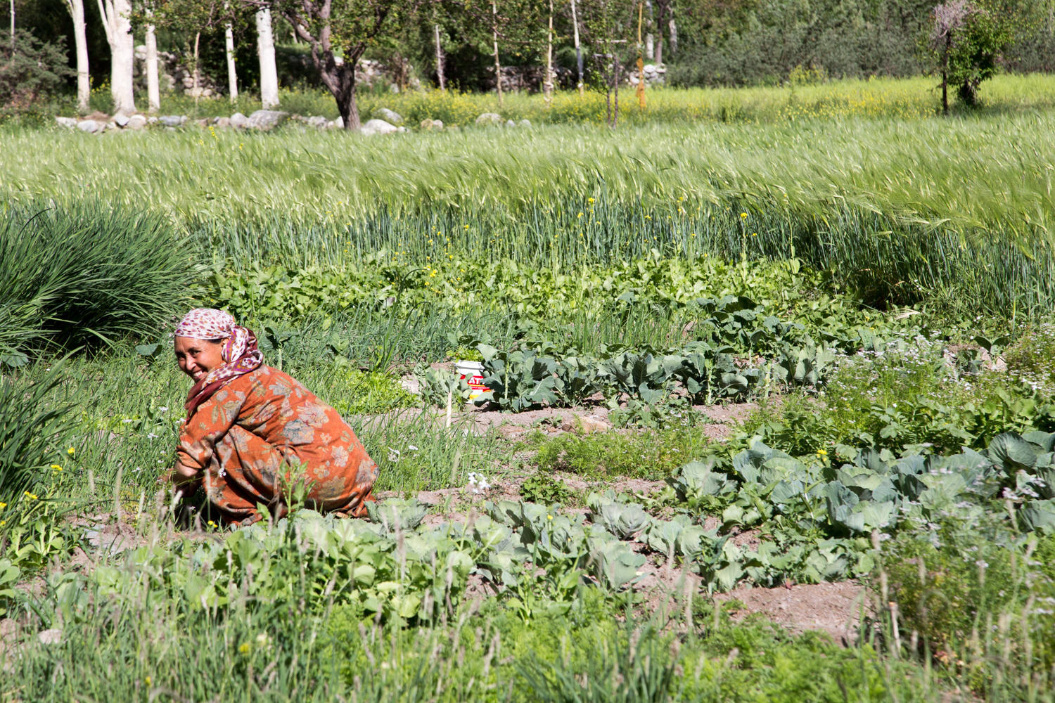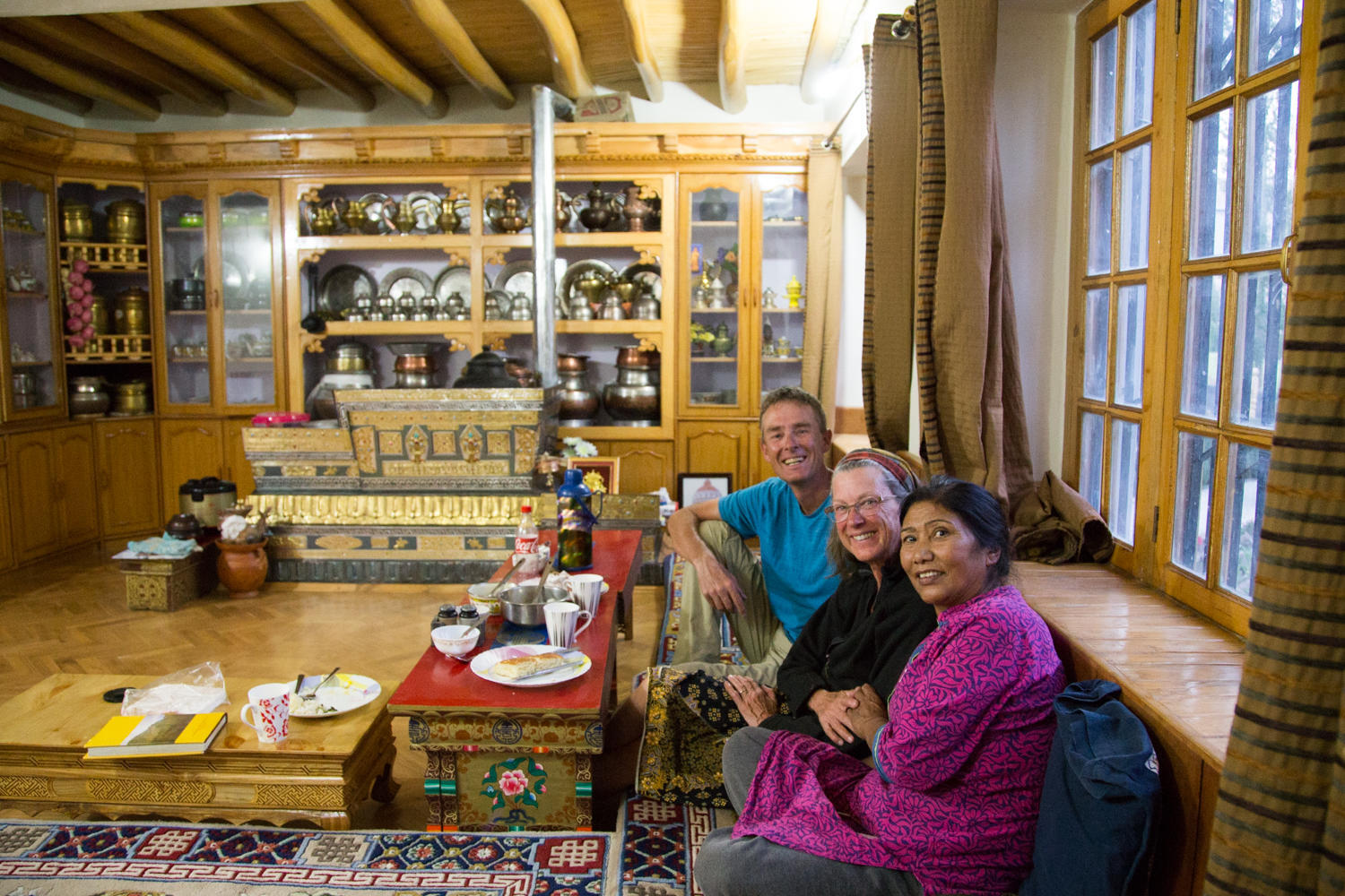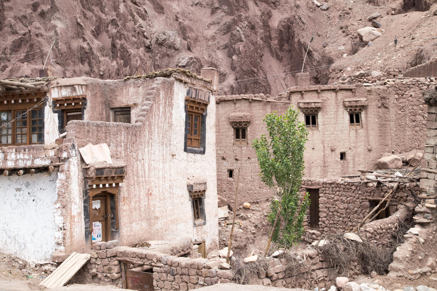 At the bottom of the downhill we reach Saspol and find the very nice Tongyok Guesthouse. The people are very friendly, the place is immaculate and we are served a nice cup of hot tea upon arrival. Saspol is a pretty village spread out in the narrow green valley. Above the irrigated land are steep dry cliffs with a ruined castle and a line of caves. We hike on narrow paths through the fields towards the cliffs. The valley is flood irrigated, narrow canals take the water down past the terraced fields. The flood irrigation reminds us of home.