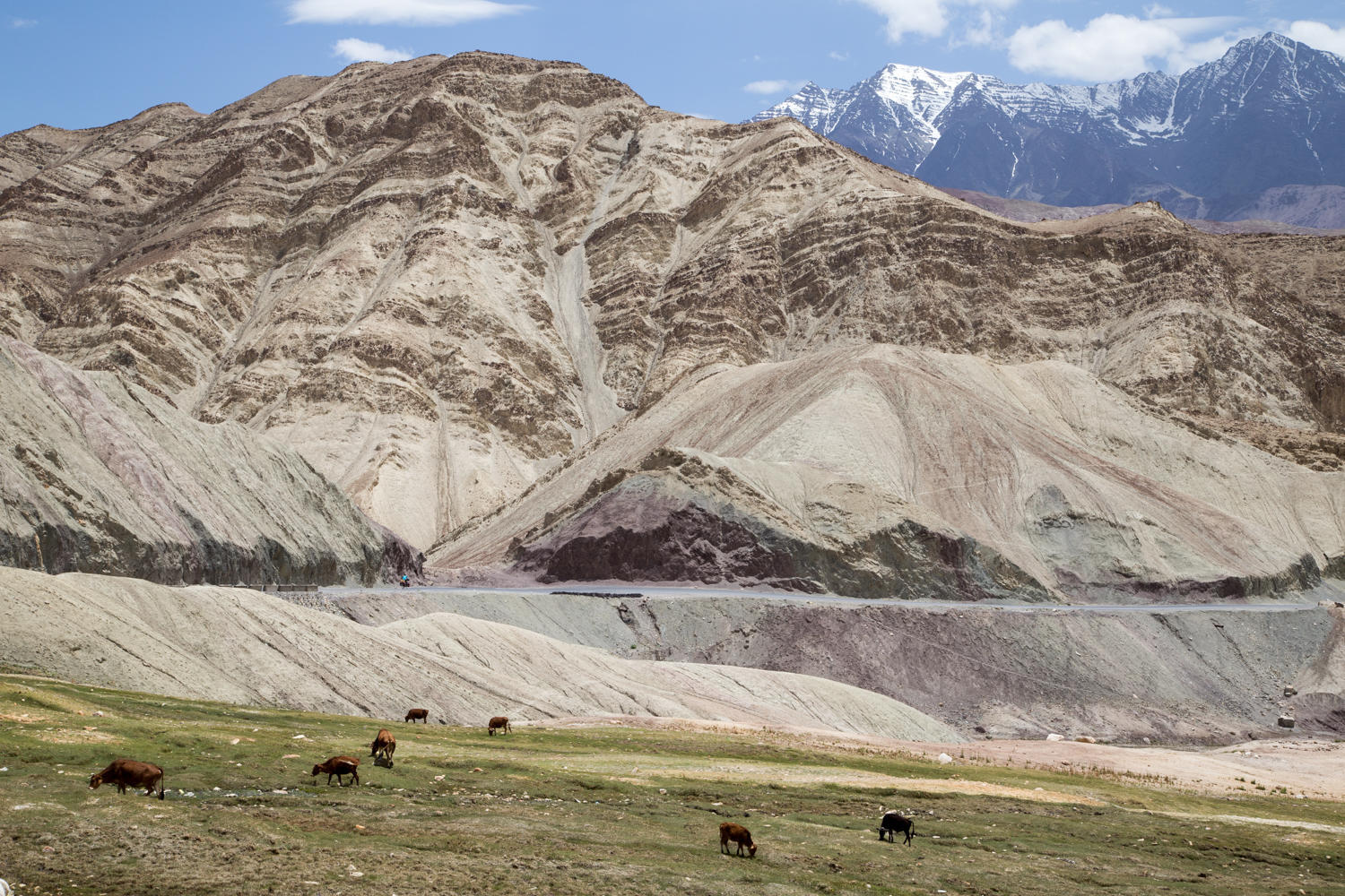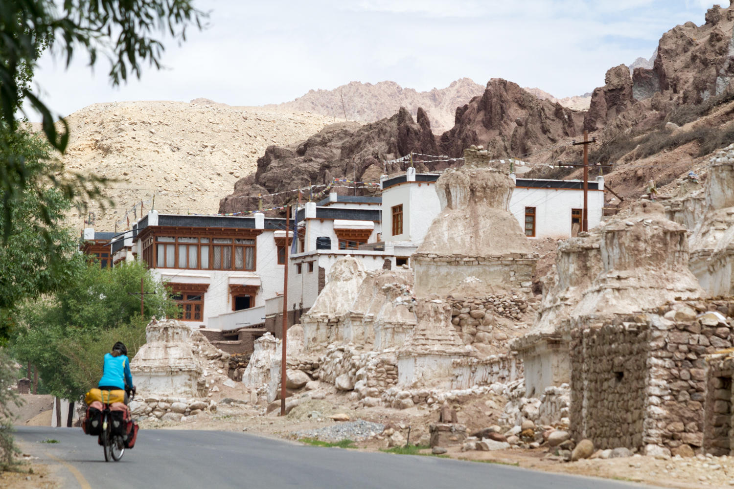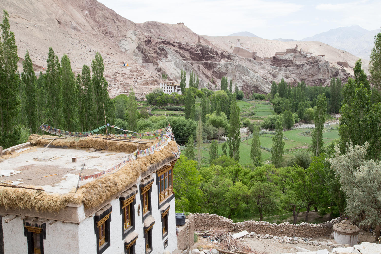 A few kilometers of flat through a nice green valley full of Tibetan houses, then starts a climb up to the next alluvial fan. The Indus River has carved itself a way through it, but the valley walls are so steep and unstable that the road needs to go over the rubble. At Basgo we start with a series of switchbacks, then a long fairly steep climb on the plain before reaching the next high point. We struggle with a headwind. Just as we start the downhill we meet a cyclist from Seattle, but he still has a long way to go to Leh and is in a hurry. We met his buddy yesterday in Leh, the guy had fallen ill and took a ride.