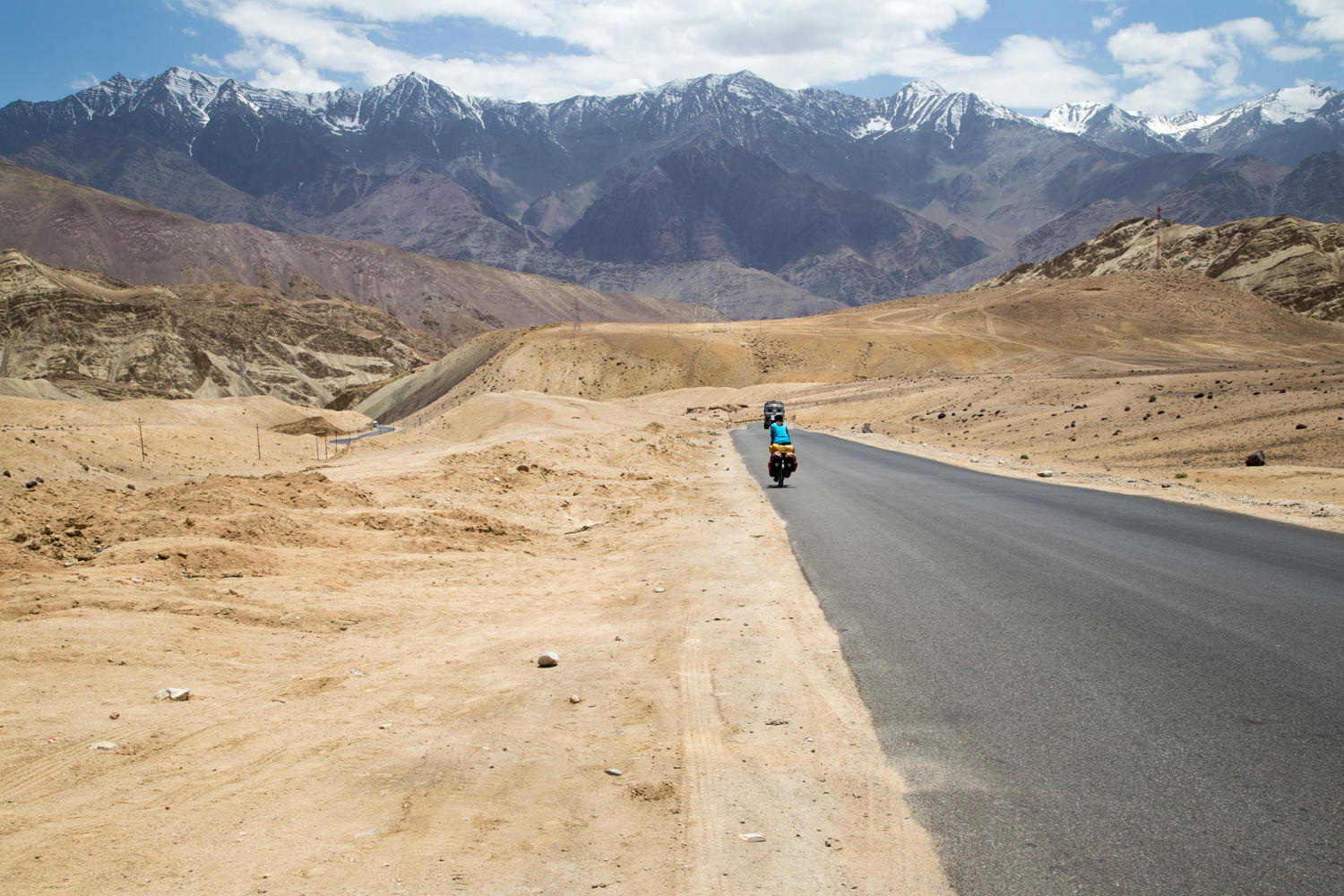 We leave town at about 7:30am. Dan has risen early to wave us goodbye. The route we choose leads downhill to the airport, but the road is under construction and it is slow going until we reach the main road again. After about 10km of downhill, just past the airport, we climb away from the Indus River to cross a huge alluvial fan. Army bases are stretched out along both sides of the highway. After reaching the highpoint we descend back to the Indus River and see the confluence with the Zanskar river. In Nimmu we take a break and eat one of the apflelstrudels (Apple strudel) we picked up in Leh. Our panniers are packed with goodies we know we won’t be able to find the next week to Srinagar.
