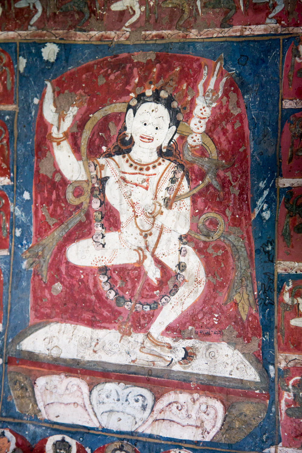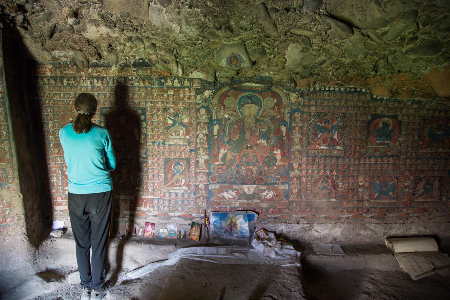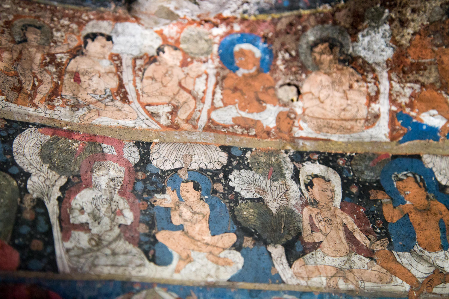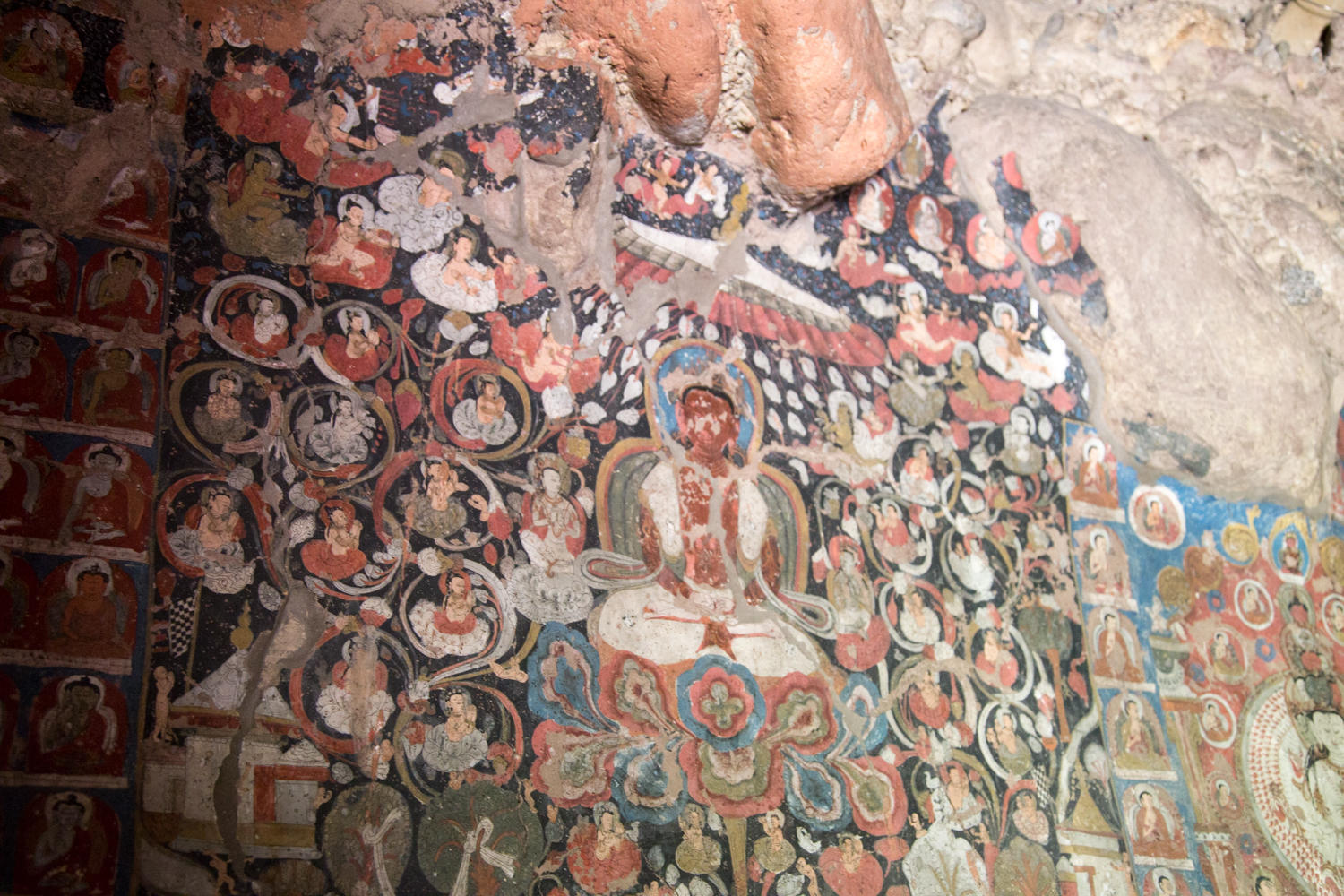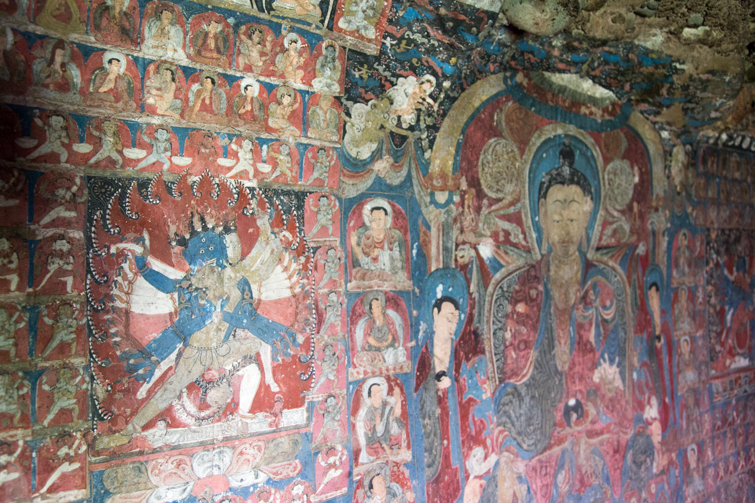 The American cyclist recommended us to surely don’t miss the “cave with the red door”, and he is right. Inside are very old wall paintings in beautiful colors. We are not sure, but it does look like someone went through with a sharpie and put some sharp lines over the figures. The caves are excavated in a cliff of river rocks and sand and erosion is taking its toll. A retaining wall has been built last year trying to slow down the calving of the hillside and preserve the caves for a few more generations.