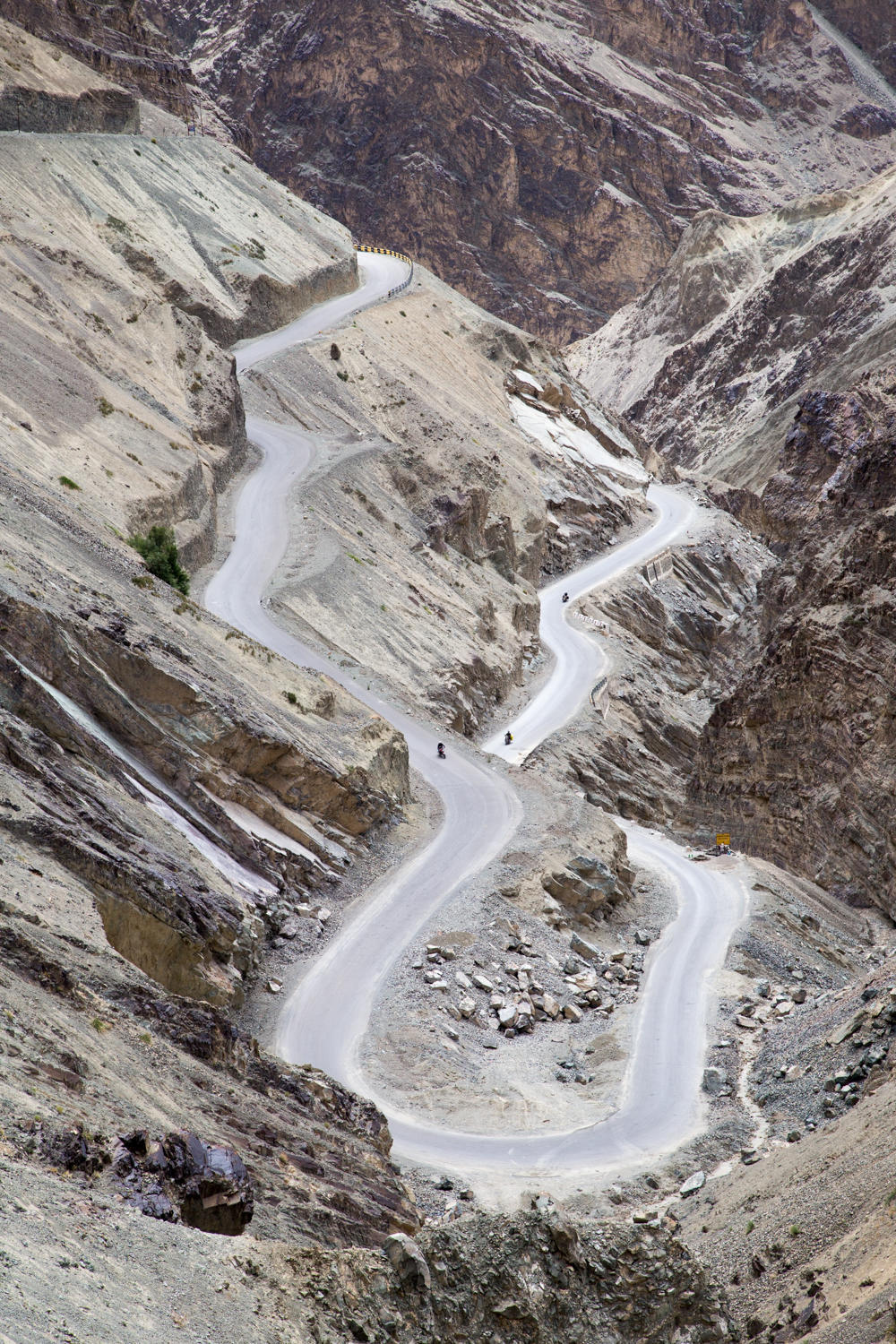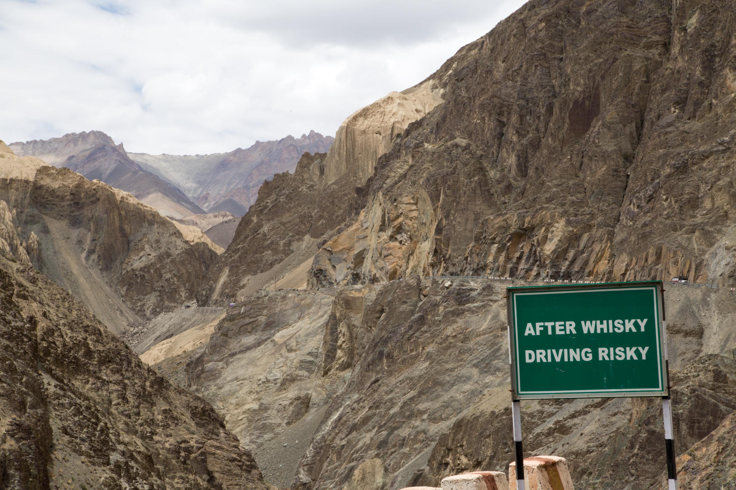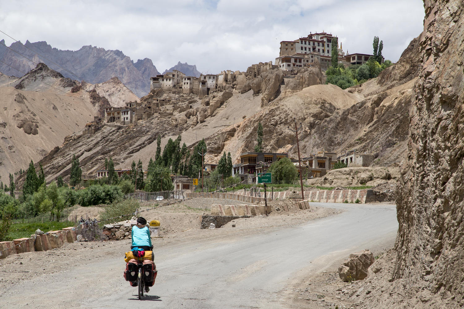 The road is undulating losing and gaining the same 50 meters following the Indus river until after Khalsi. Here the river continues into Pakistan. We have Military convoys pass us. Switchbacks begin at the Wanla turnoff. Sometimes very steep, we reach Lamayura and find the Moonland Hotel, on the switchback just below the monastery. We'd heard that the monastery guesthouse was decent, but we decided we were done climbing for the day. For 1200 rupees, we roll bikes fully loaded into the room, a warm shower, and the first time in India, a notice to put toilet paper in bin.
