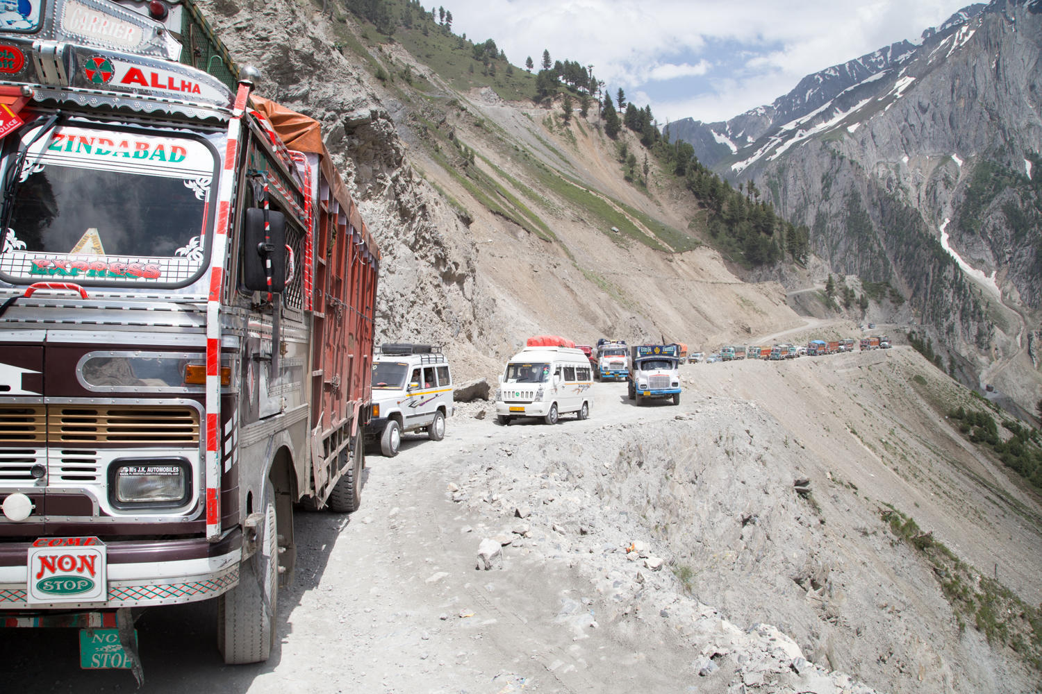 The top of the pass is a zoo, there is a large patch of snow where snowmobiles tow sleds and people up to ride back down. A dozen dhabas, hundred cars and many more domestic tourists probably getting their first taste of snow. At the beginning of the downhill, we have our daily military convoy pass by.