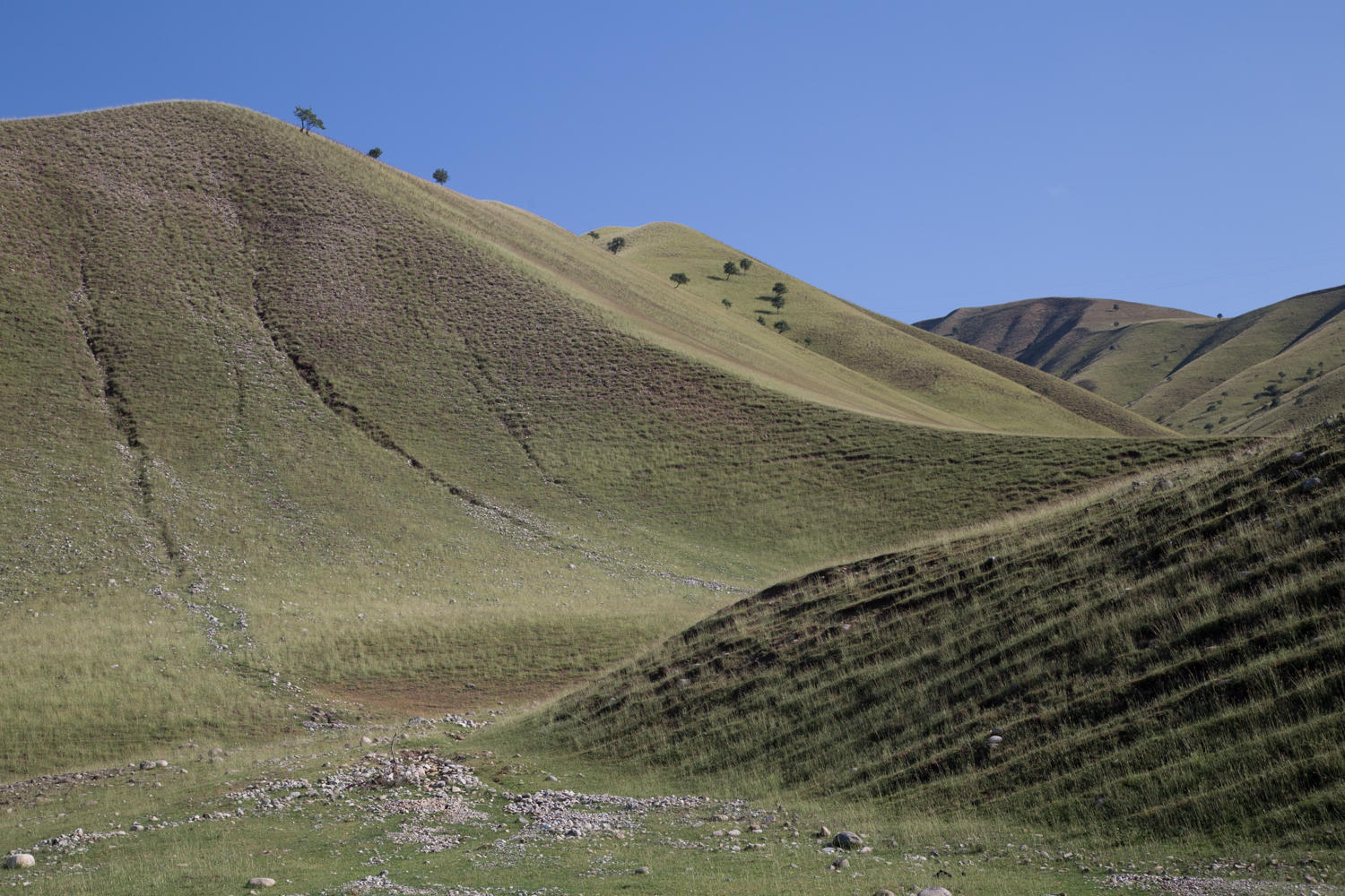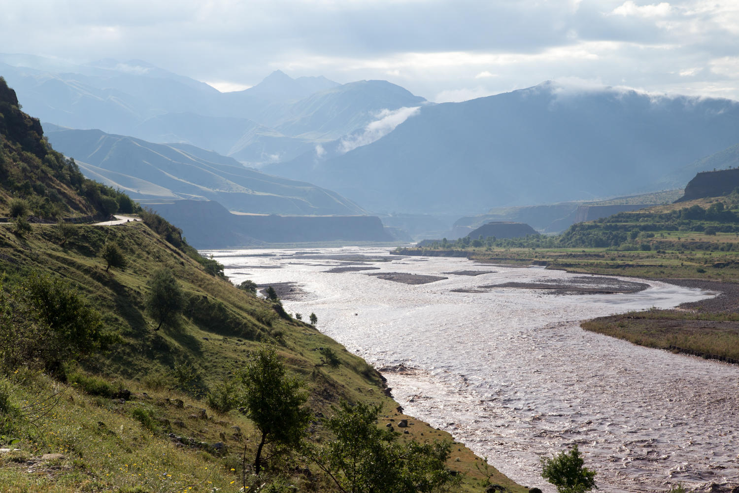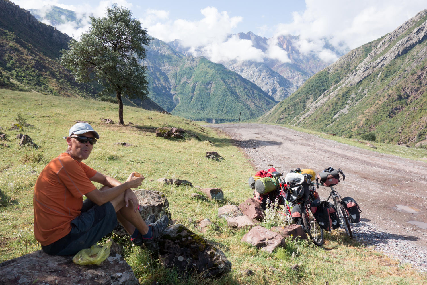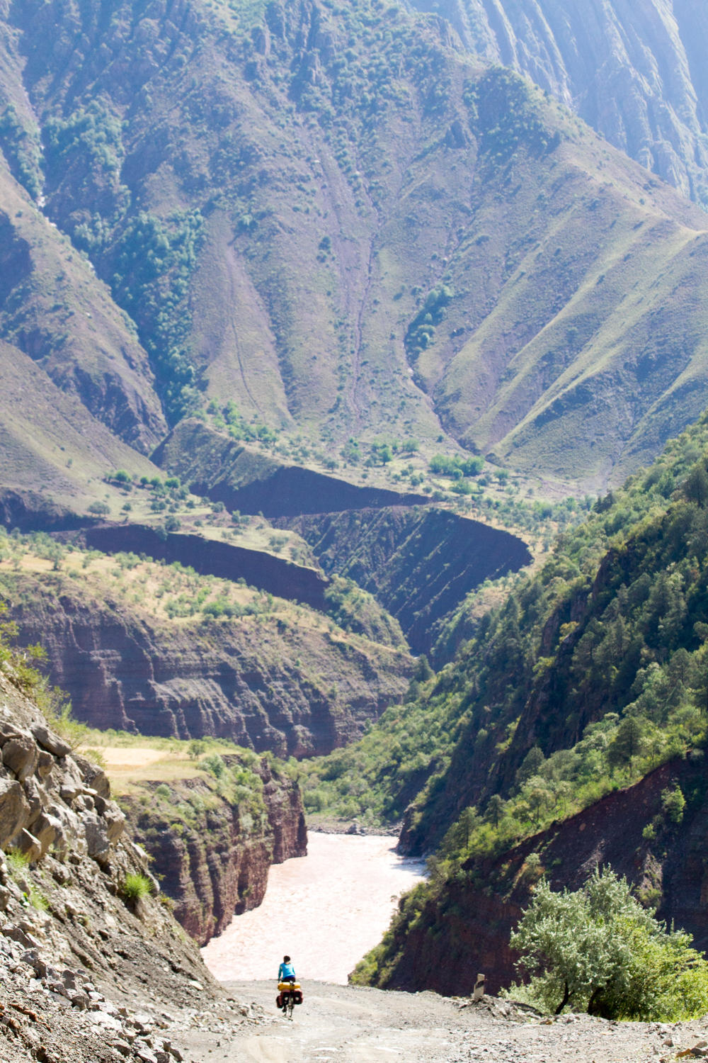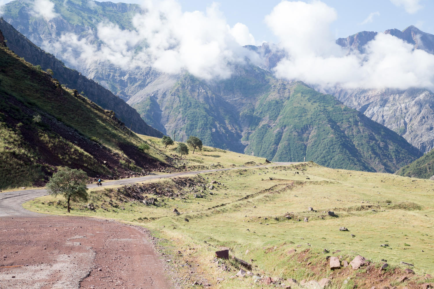 In the morning after the rain, it was sweet to have been under a shelter and pack up a dry tent. We head out after our cornflakes and chai before Will and Jo hoping we see them again sometime along the road. After crossing the bridge, the road climbs and then up on a plateau then after 8kms we reach the turnoff. The policeman sitting in the middle of the road shows no interest in us as we turn right and the tarmac ends. The left turn goes to Kyrgyzstan and takes most if not all of the traffic.