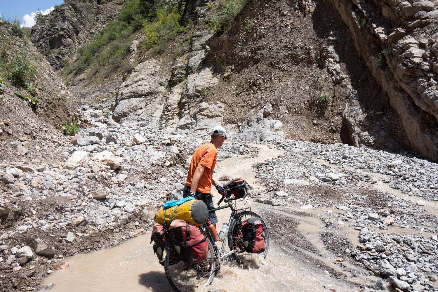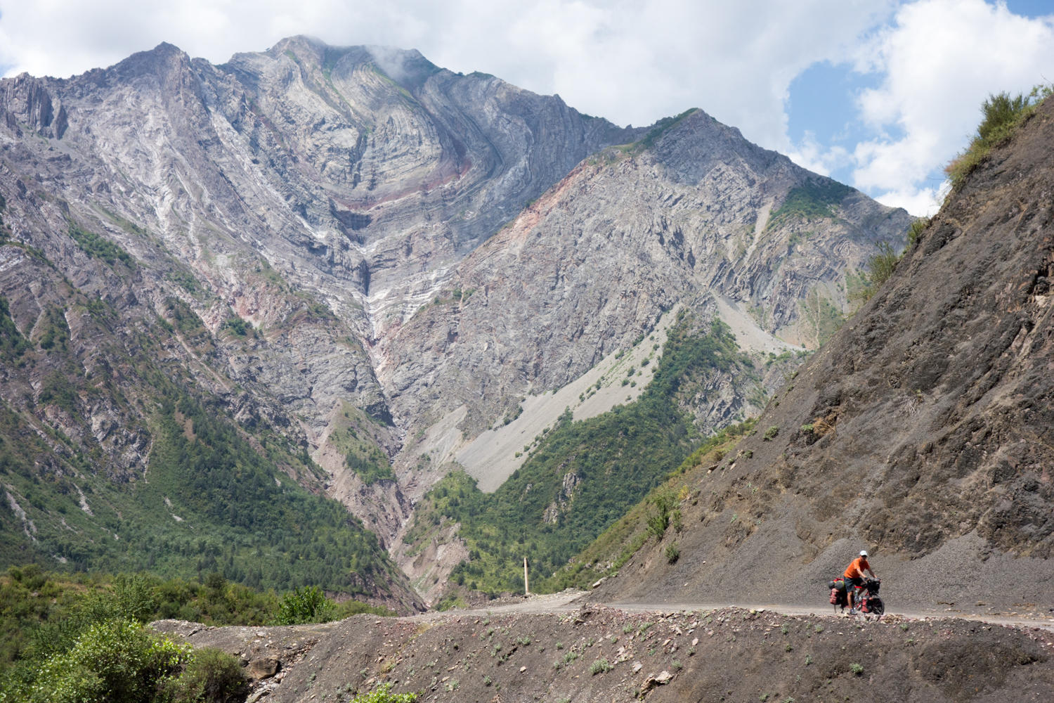 All of a sudden we see a solo cyclist appear from behind. We are just cresting a hill that was too steep for us to ride, so we push our bikes to a flat spot and wait for him. To our amazement the cyclist mutters a "Hello" and keeps riding. Rachel had just taken a photo of him, disgusted she deletes it from the camera.