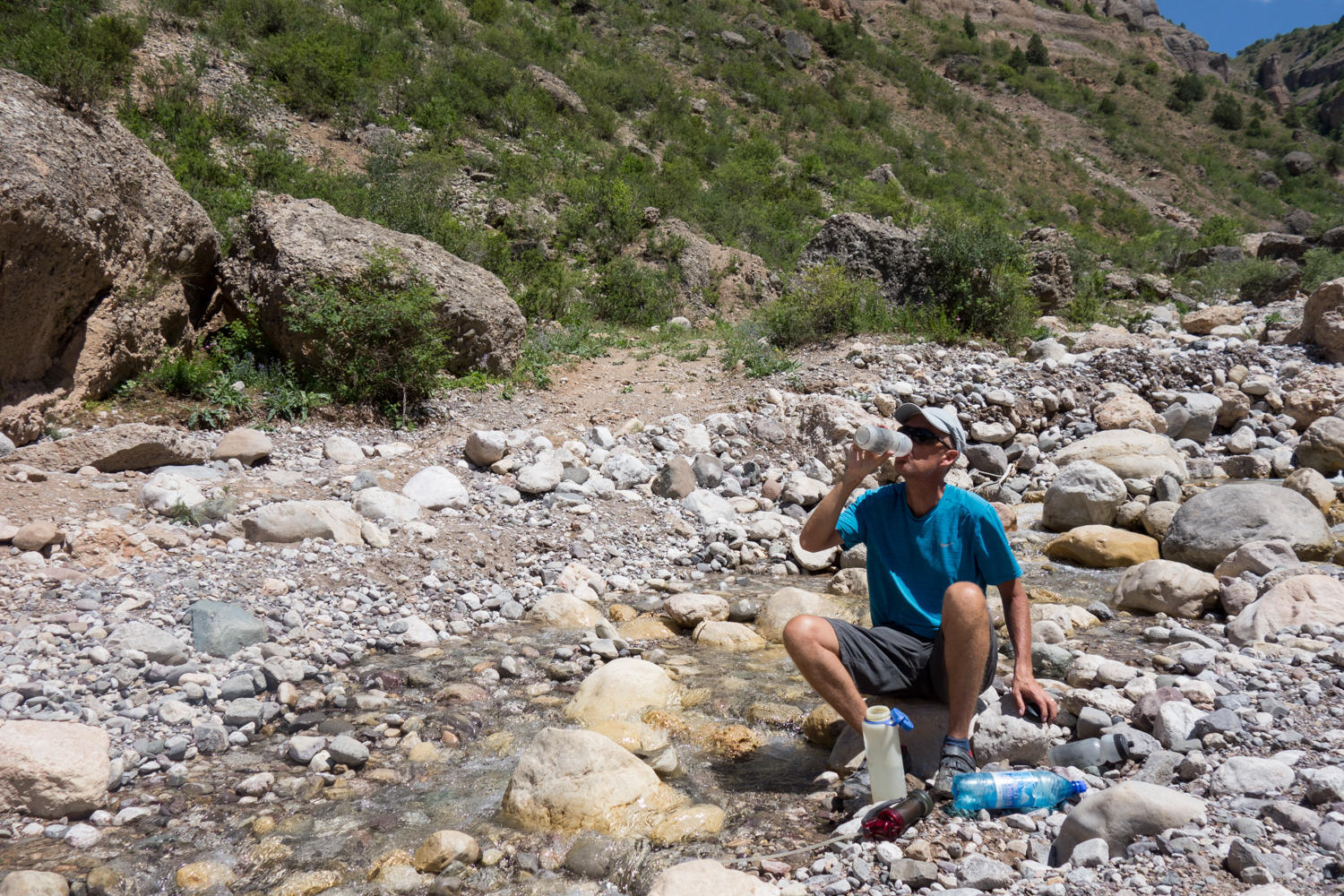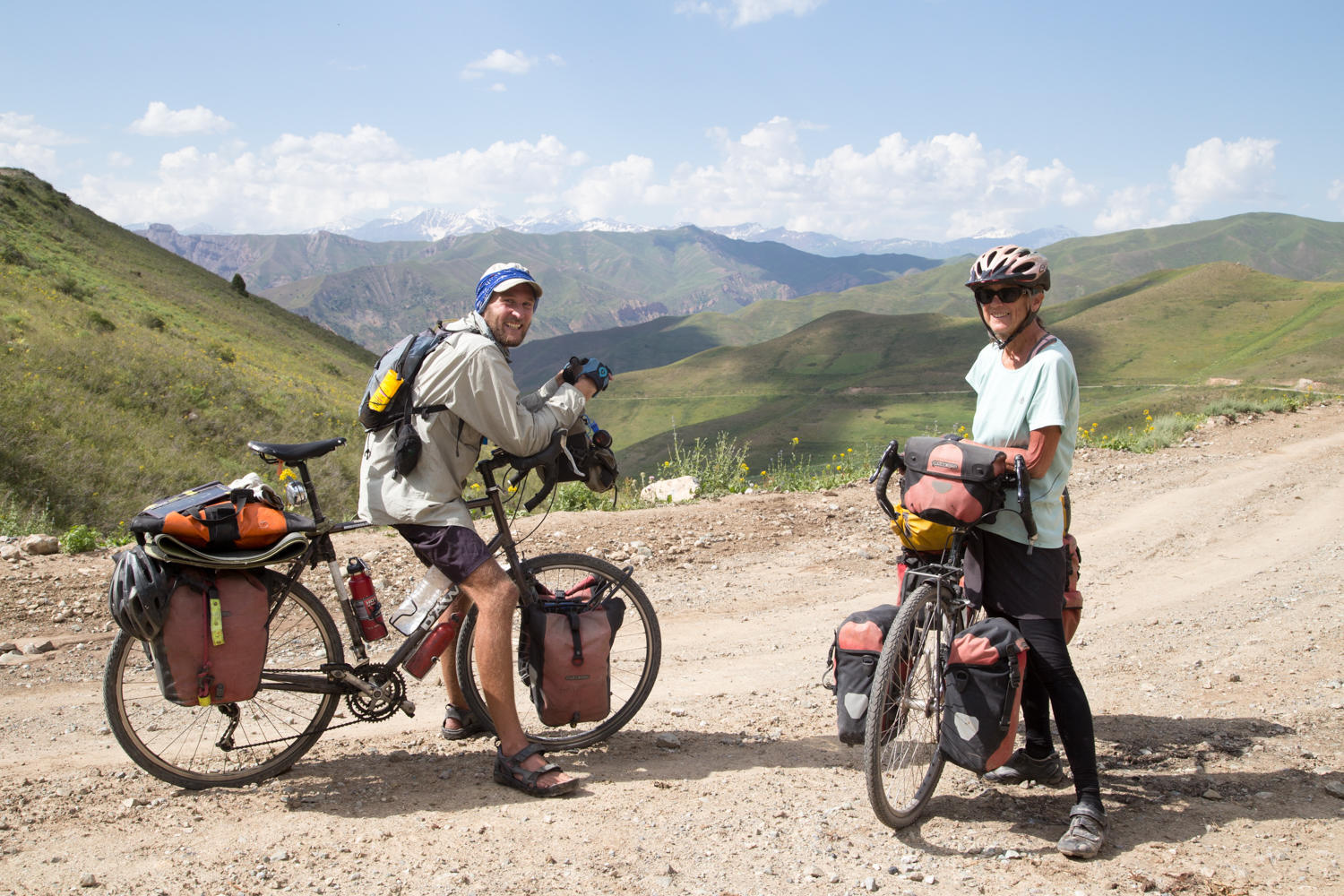 Up early, we head out of town and within a couple kilometers, we have to cross a boulder field, evidence of yet another flash flood wiping out the road. Today is our 21st wedding anniversary, and we pass by sunflowers, reminding us of 1994 in South Africa the big sunflower fields. A year ago we celebrated the 20th anniversary in Gori, Georgia. After 10kms, there is another huge boulder field to cross.