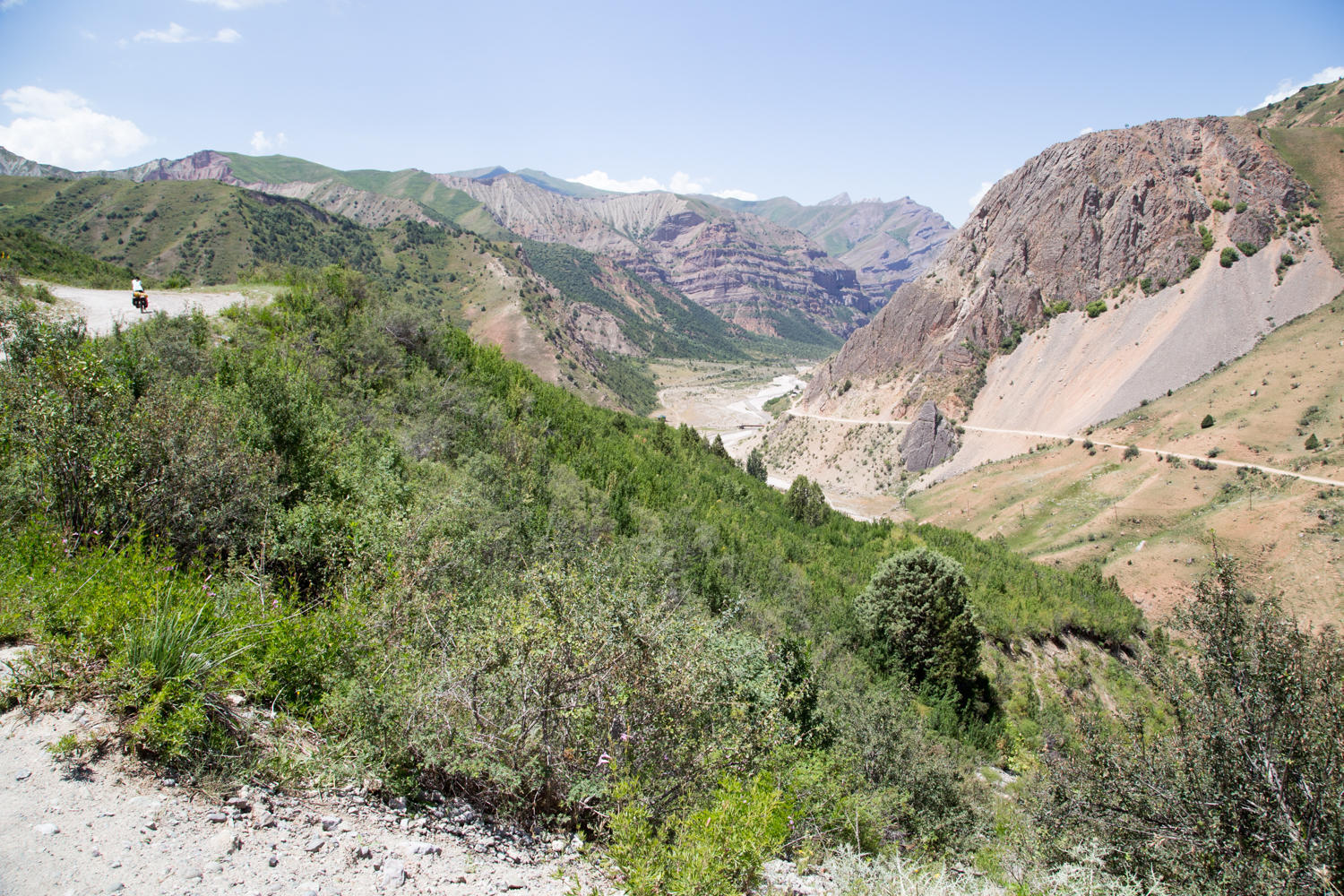 We cross the bridge over the river, across another wash out and stop at a police checkpoint. The road continues to follow the river until the road turns away and we start the climb toward the pass, gaining only 50 meters, so most of the elevation gain is ahead. Tavildara is at 1600 meters and the summit to the pass is 3250.