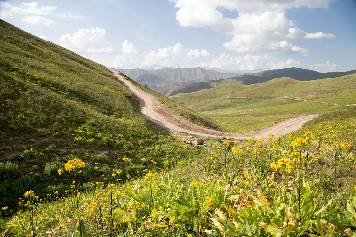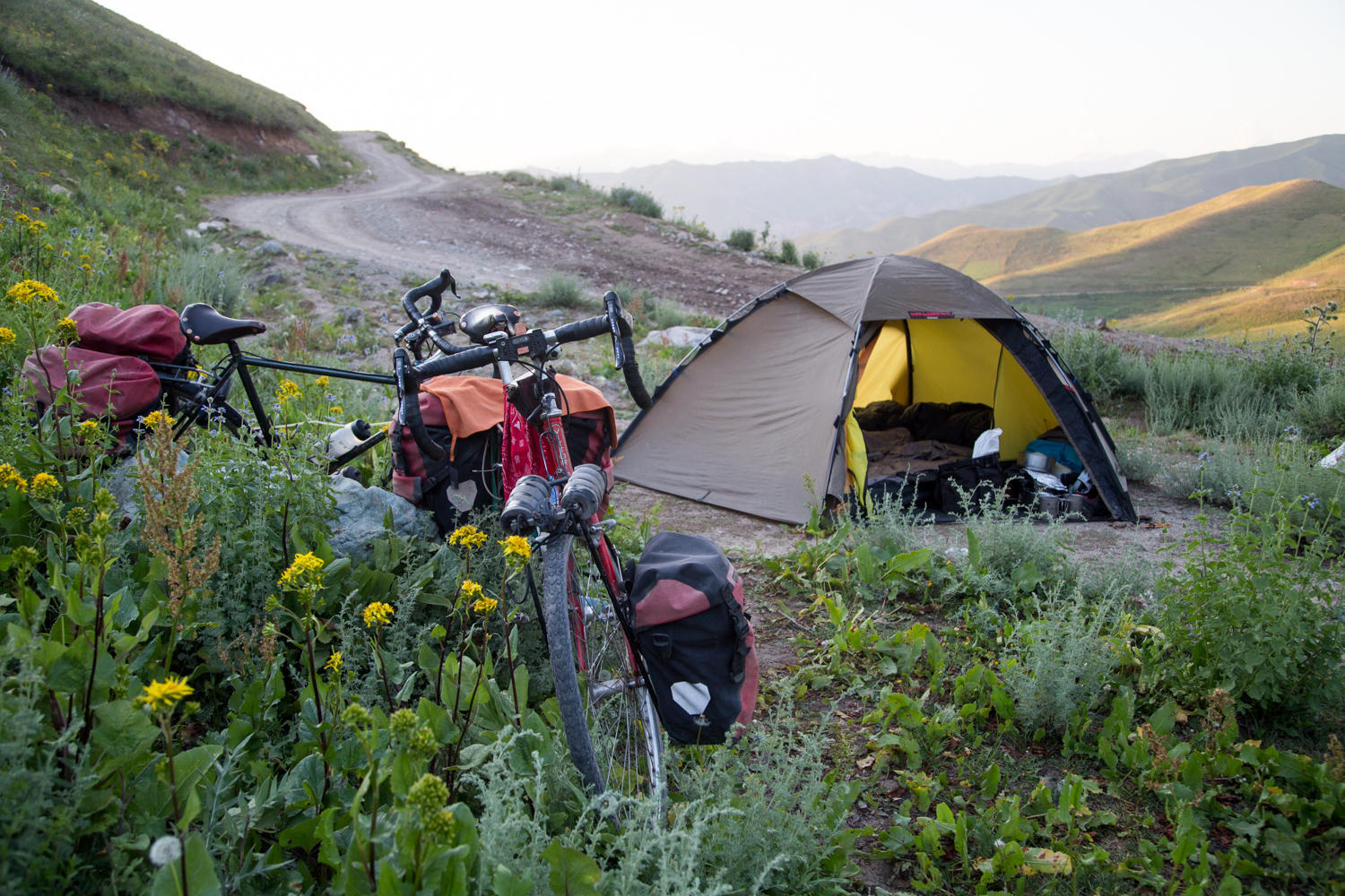 Our campsite in a gully at about 2760 meters on Sagirdasht Pass. The proximity to the road is not an issue, while we are there only a couple of cars pass.