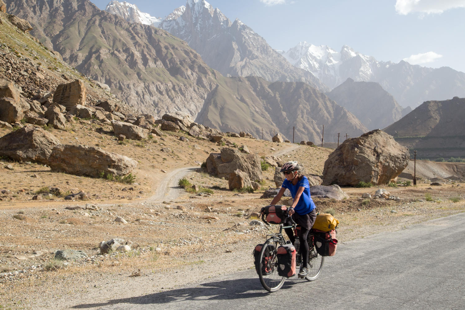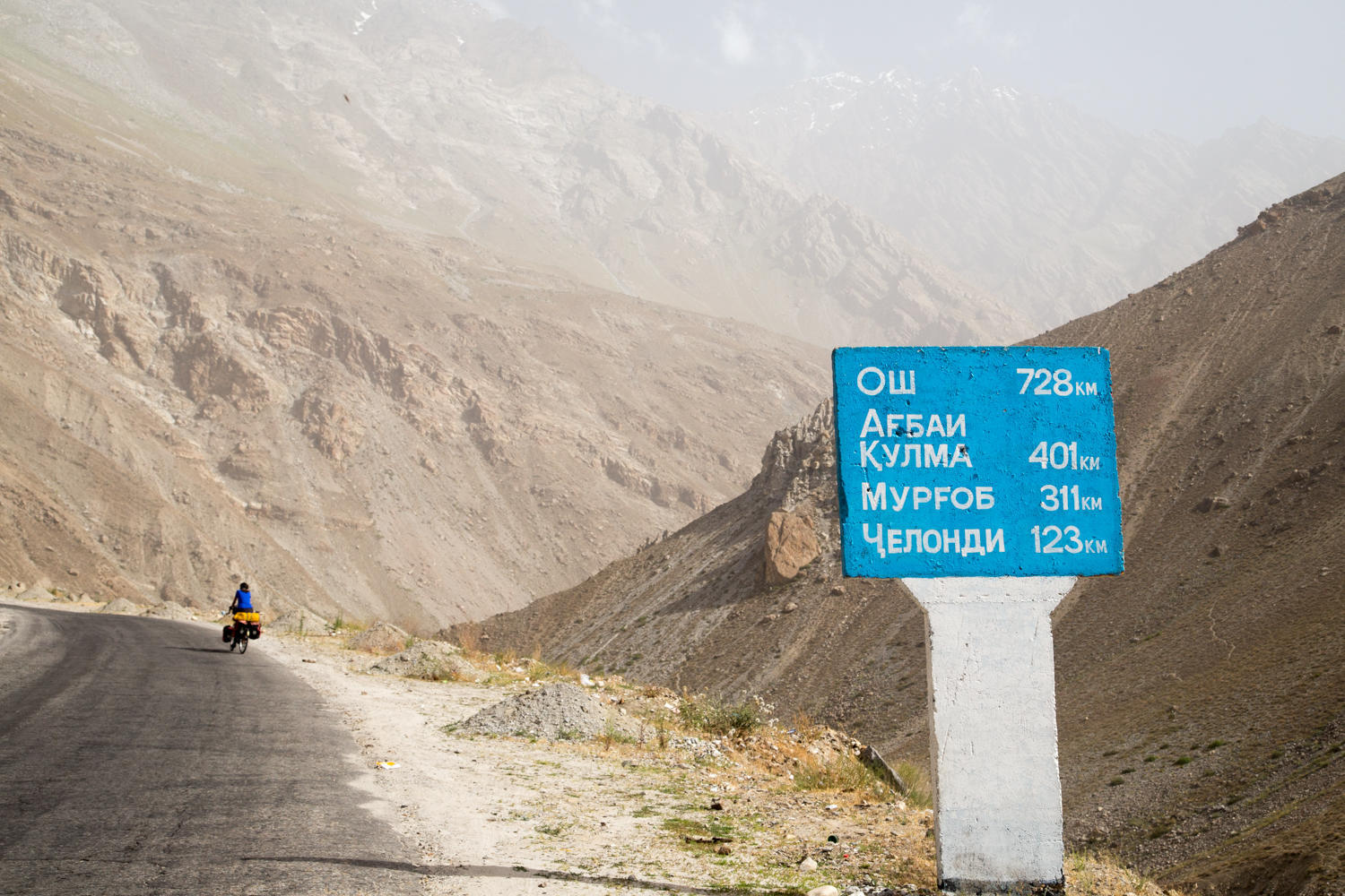 Right out of town there is a tough climb up to a series of avalanche tunnels. Then a short downhill to a police checkpoint. It takes them a long time to scrutinize our passports, visas and the GBOA permit. This region of Tajikistan has an autonomous status that goes back to the Soviet days. The western part is mostly inhabited by the Pamiri people, further east are the Kyrgyz herders. To travel here one needs a 20 dollar permit.