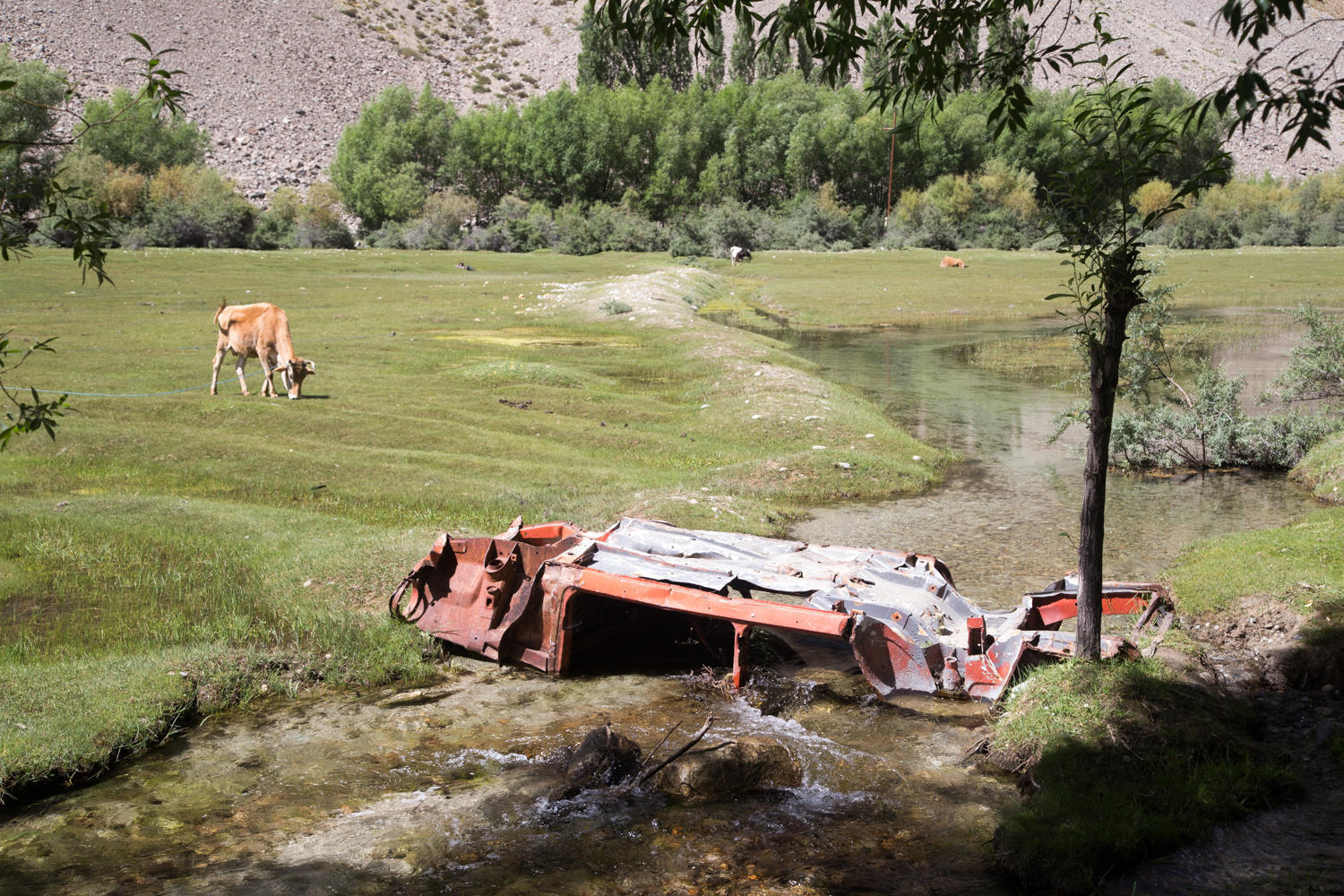 After about 62 km we expect a village with a restaurant, which would make a possible camp spot, but no such luck. There is a town and we even see a touring bike with orange panniers parked against one of the houses, but no restaurant. We continue on and check out a couple of places for wild camping. The Dutch pass us again. There is a good spot behind some willow bushes behind a bus stall, but some guys in a Mercedes that see us want to charge 30 Somoni for the spot. No deal. We ride another kilometer and find a very nice spot on some green grass, next to an irrigation ditch and hidden from the road. The irrigation water is a bit silty, but the filter takes care of that.
