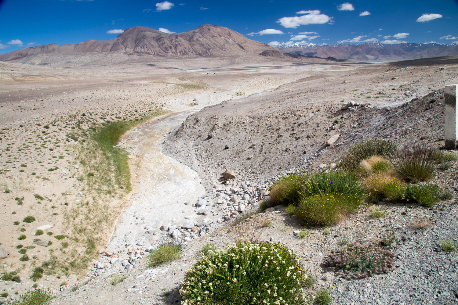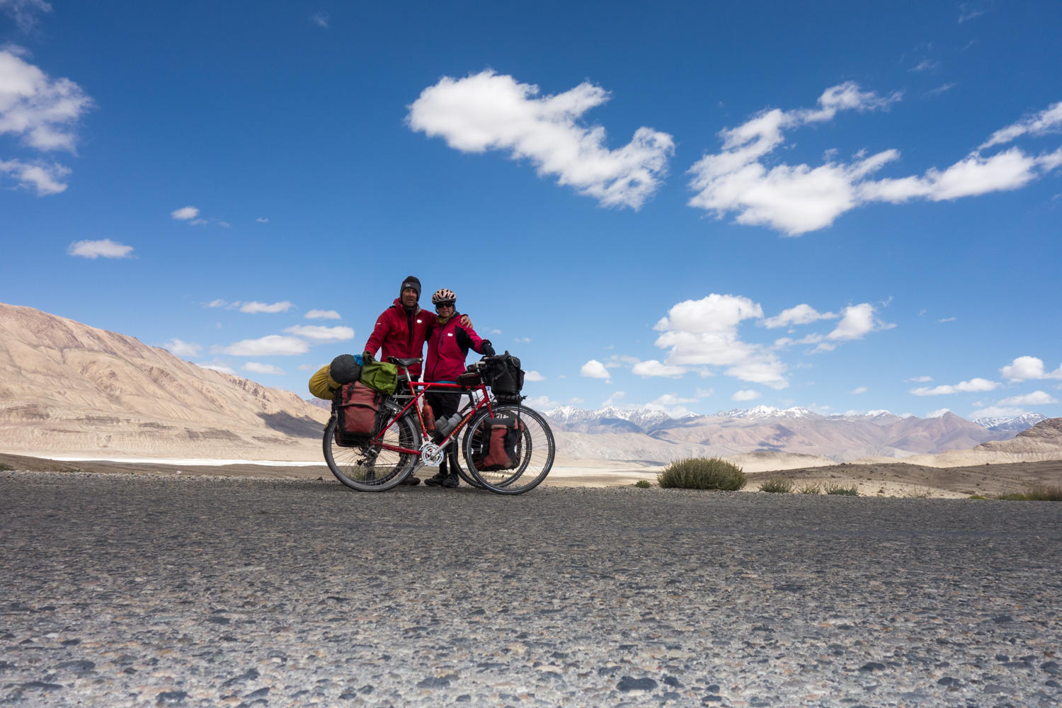 We reach a viewpoint from where we look down onto a wide open valley with two lakes. Below us are the grey colored Tuzkul and blue Sasykul lakes. A nice downhill takes us to the Wakhan Valley turn-off. I think we made the right decision going route M41, this route was not easy either, but the Wakhan would have been too hard mentally after the cycling we have done, in Spiti and Ladakh the last couple of months.