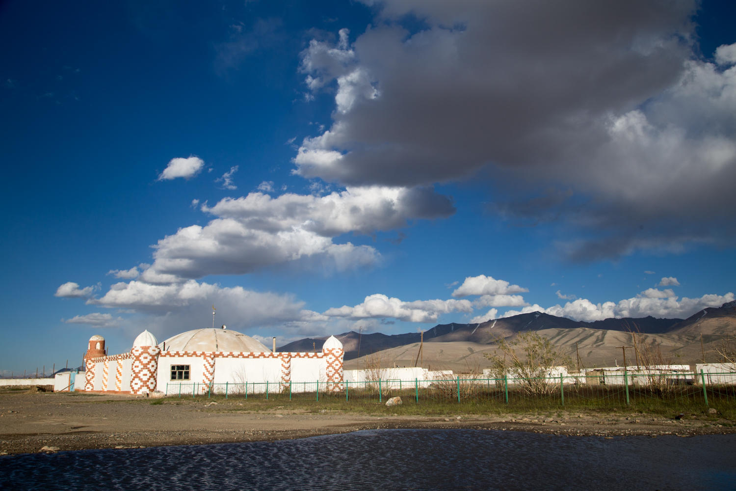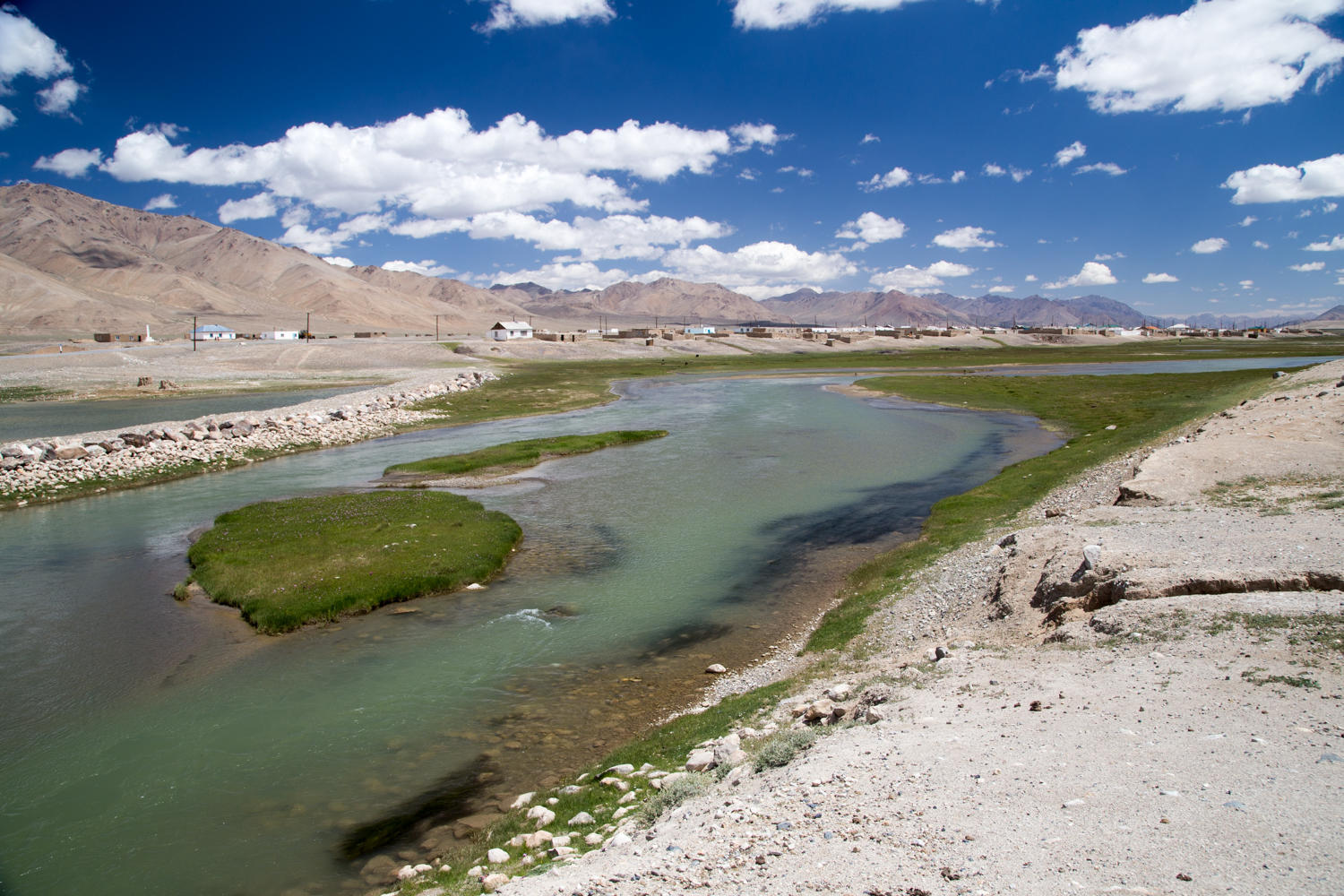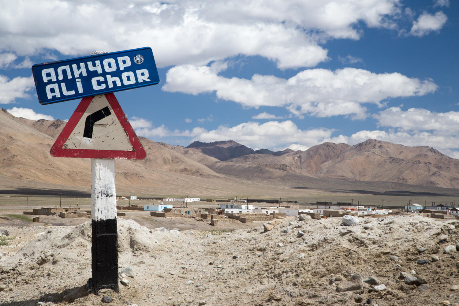 A couple more unexpected hills with nasty steep sections take us to another high point from where we can see Alichur. A collection of white washed one-story square buildings set in a wide green valley against a backdrop of rugged rocks and snow covered mountains. A very isolated place, even this time of year. We can only imagine how it will be in winter with minus forty degrees centigrade and the wind blowing.