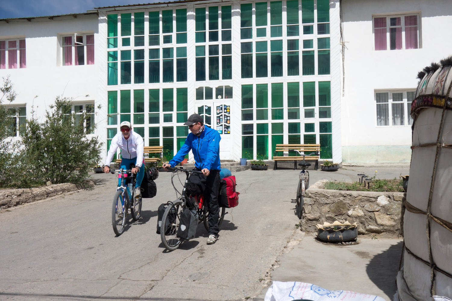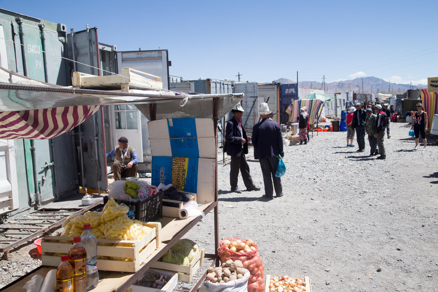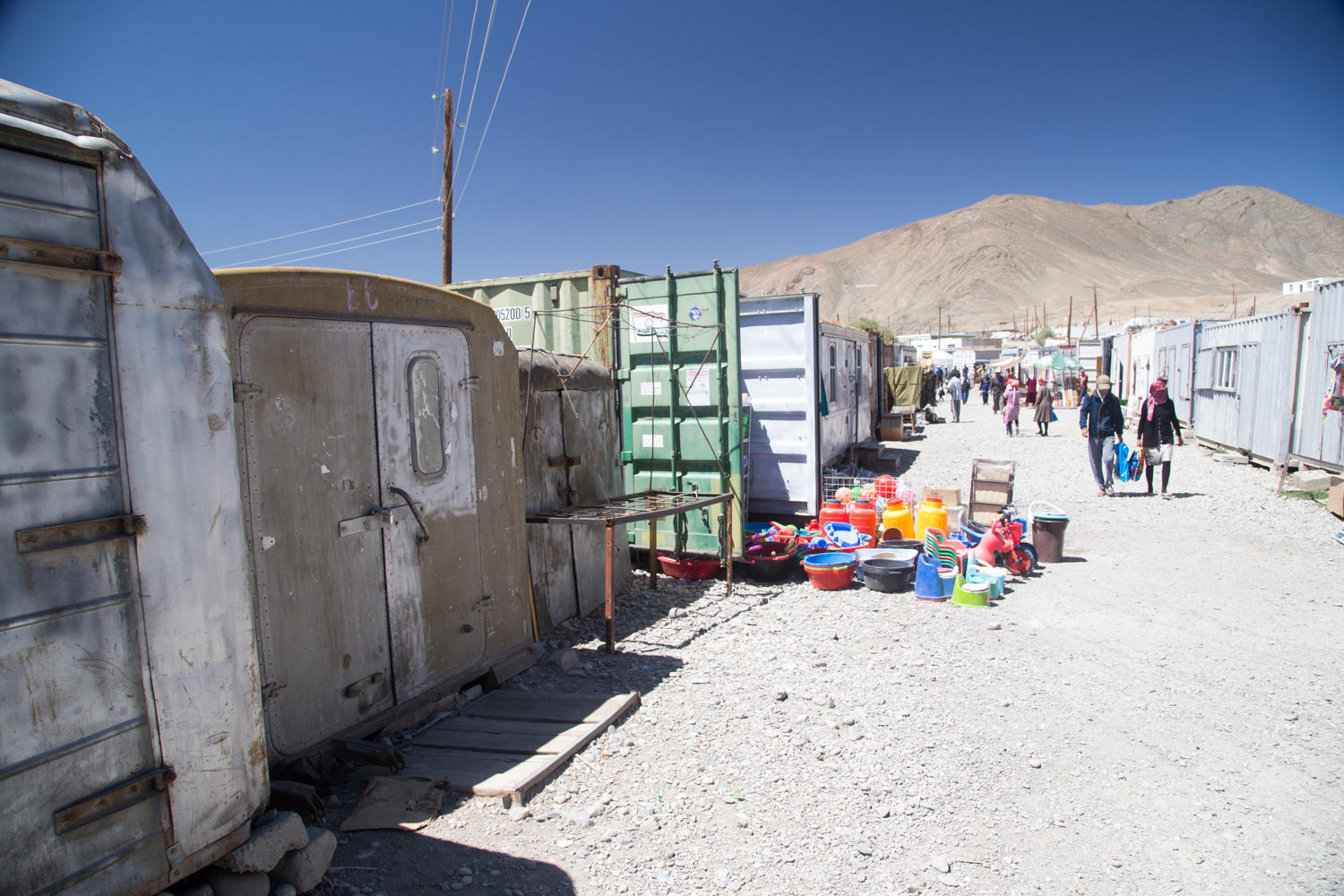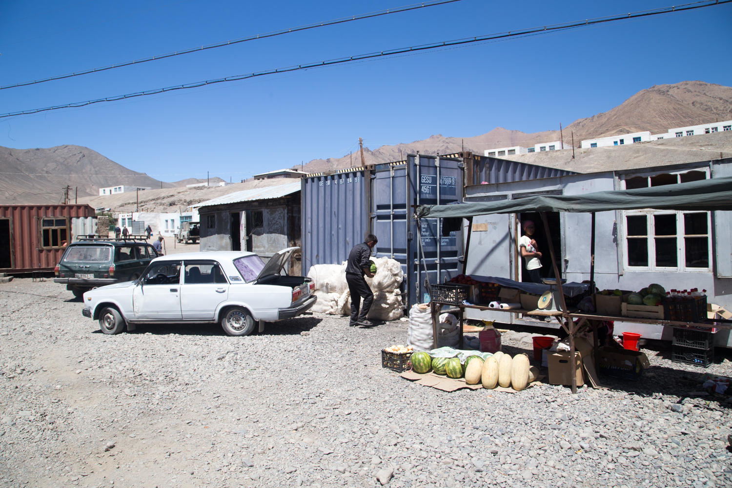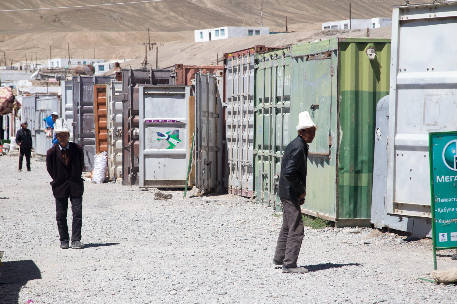 On day one we visit with Maarten and Edwin while later in the day the Super Cycling Man, Will, arrives. Day two is when Sarah and Tony and a little later Jo arrive. Will and the Dutch guys have already left by that time. We roam the container bazaar and several larger shops and manage to collect enough edibles to get us to Karakul and maybe on to Sary Tash.