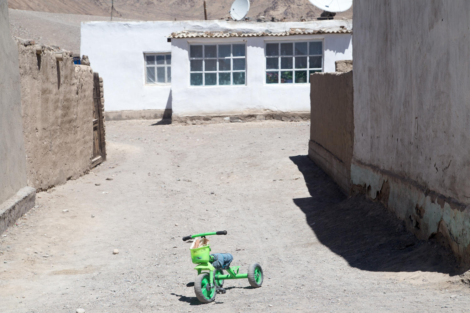 It is surrounded on three sides by red brown rocky canyon walls, while the river valley to the east looks out upon two 7000 meter plus peaks in China. Most buildings, except for the hotel, are one story, white washed adobe square structures with flat roofs. Only two streets are paved, the main M41 which passes right in front of the Pamir Hotel on its way to Kyrgyzstan, and a second road which branches off and heads towards Kashgar China. That border crossing is still closed to foreigners though.