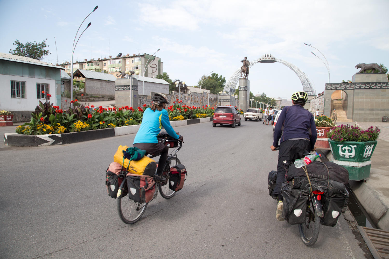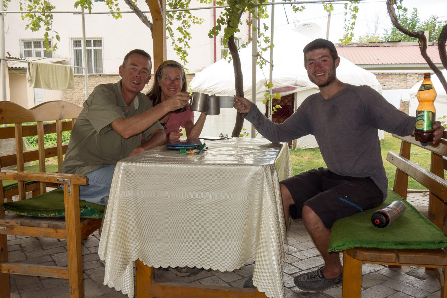 Our tents are wet from the overnight rain, and everything is damp. But a tailwind is blowing and we have only about 50km to go, most of it downhill. We cruise! It has been a while since we were able to use the big chain ring. Upon entering Osh we navigate ourselves to the TES hostel. A very nice place, not too far from the city center. To our surprise we find Tony and Sarah and Will (Super Cycling Man) also at the hostel. We knew Will was ahead of us, but Tony and Sarah must have past us in Sary-Tash. They were at the pink hotel above the supermarket while we were only a block away!