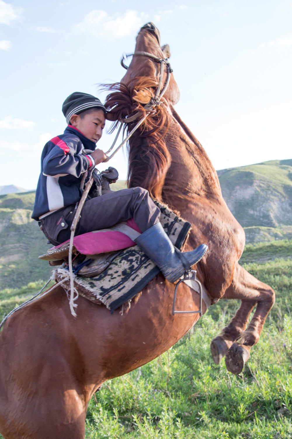 Then a downhill, some more uphill and a steep descent to a river crossing. This repeats itself two more times, by the last climb we are both pretty wiped out. No way could we have done this yesterday. The scenery is very nice again, green hills, white yurts, horses and cows everywhere and farmers cutting the tall grass and wildflowers with large scythes. The hay is left to dry, then raked into large piles that dot the mountainsides everywhere you look. All this hay is probably trucked down to the valleys for winter feed.