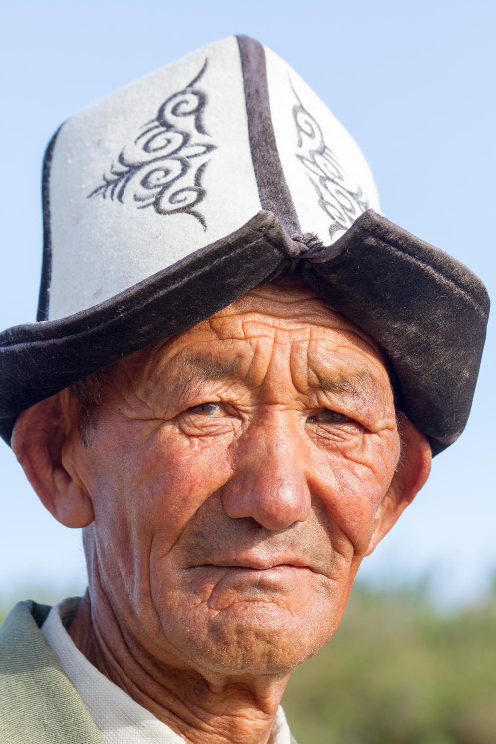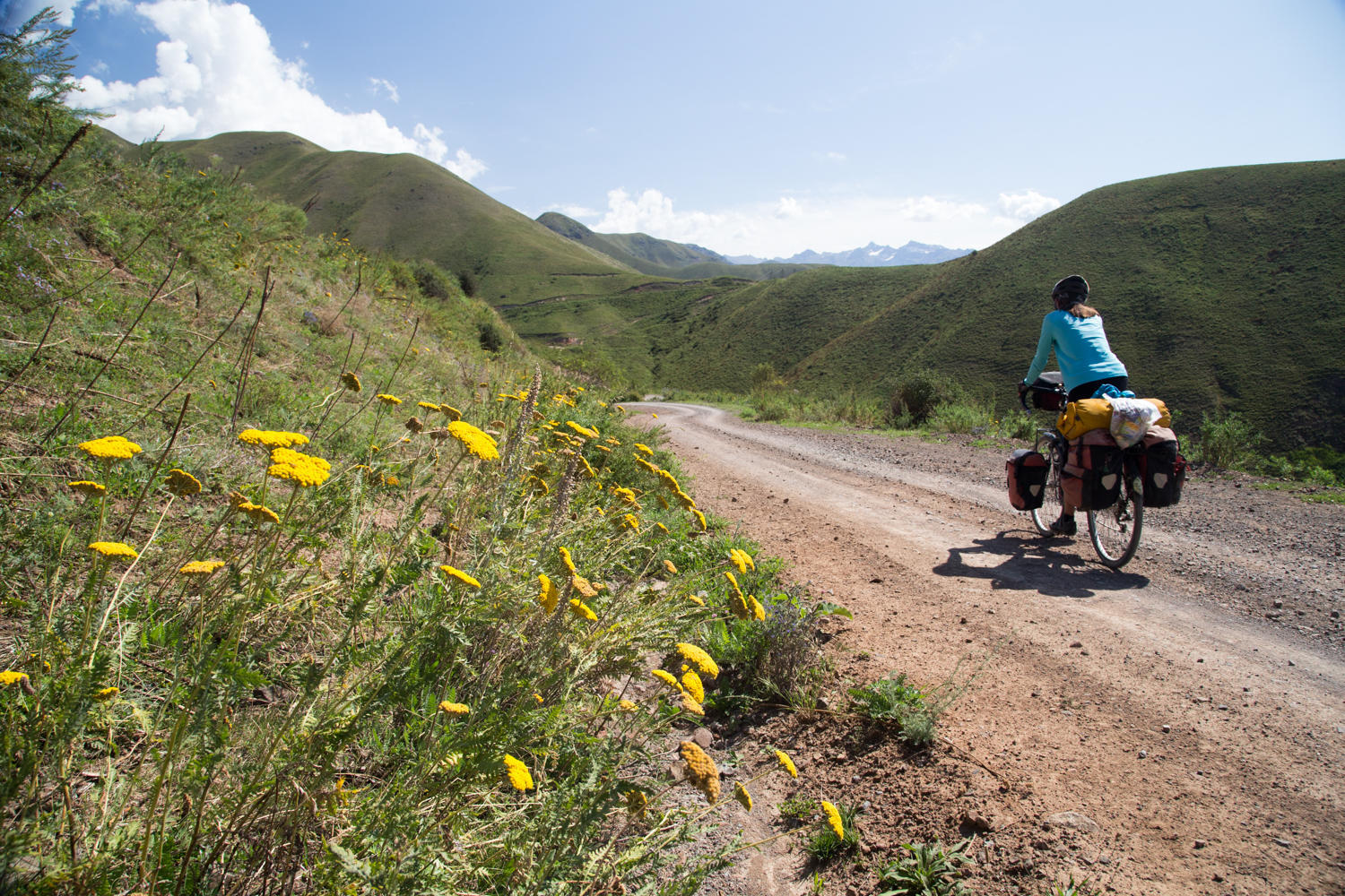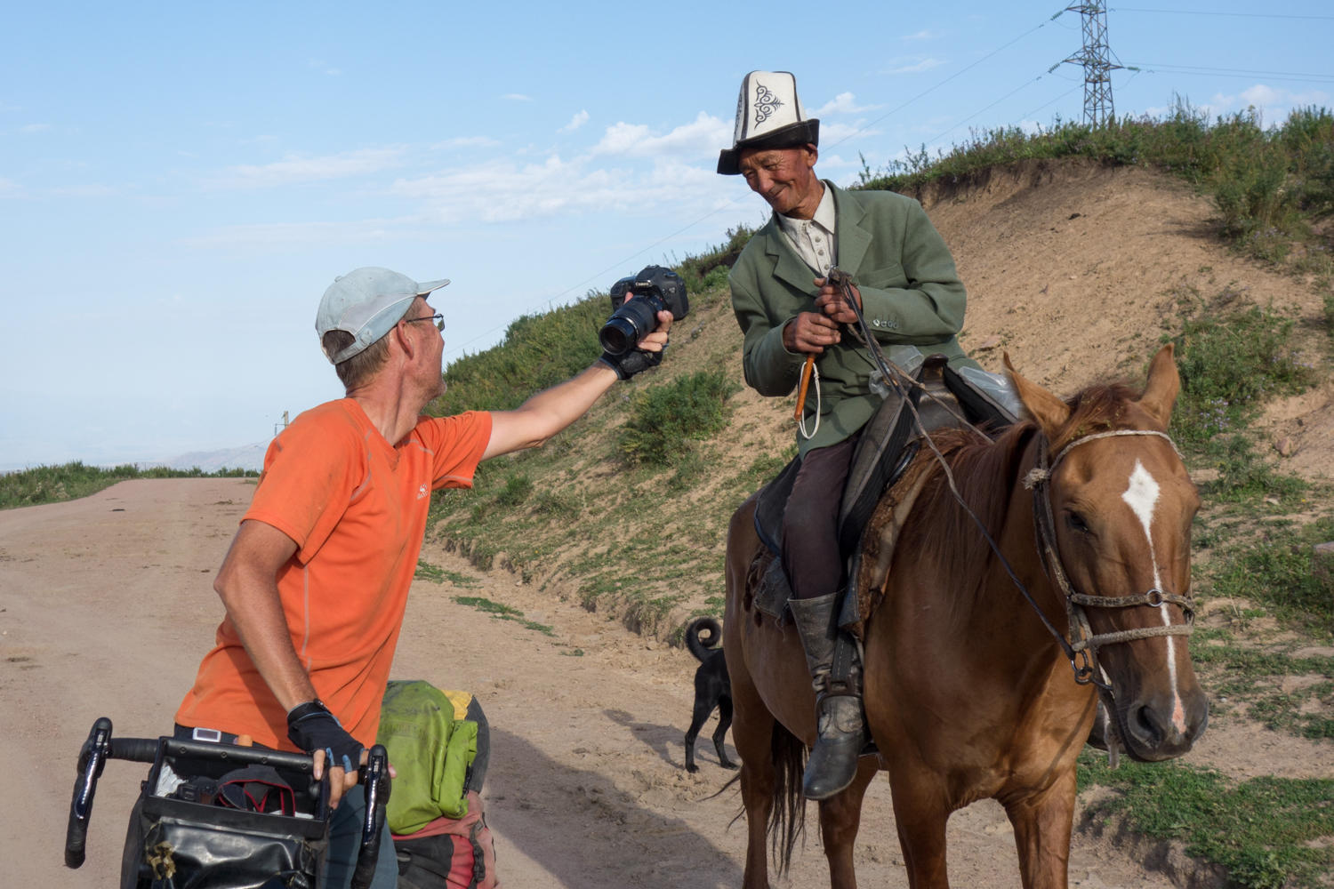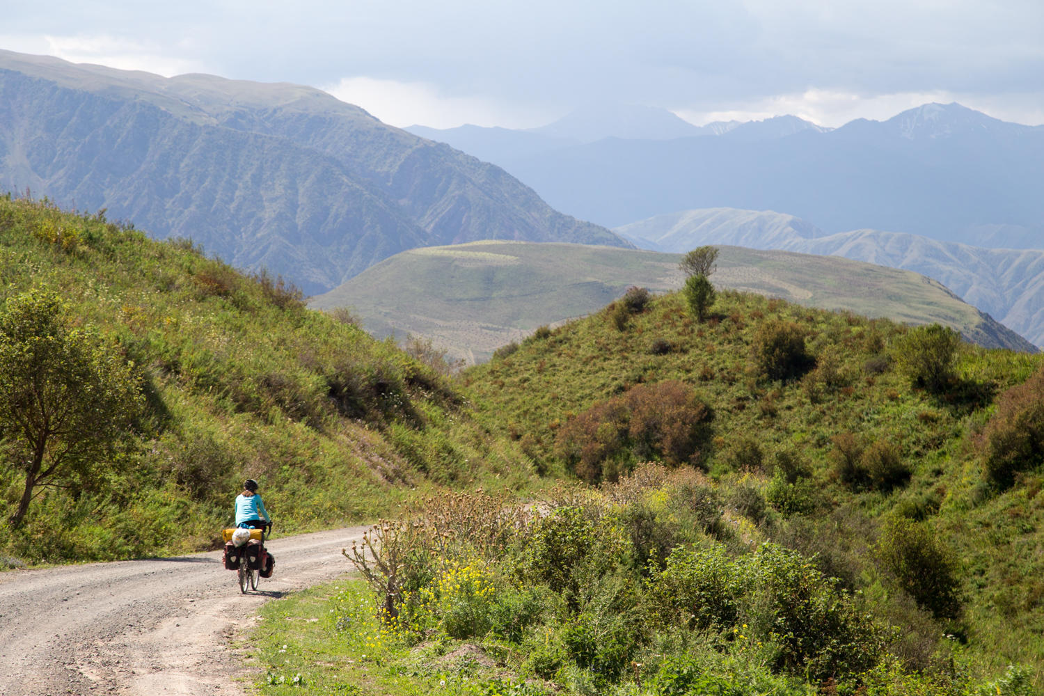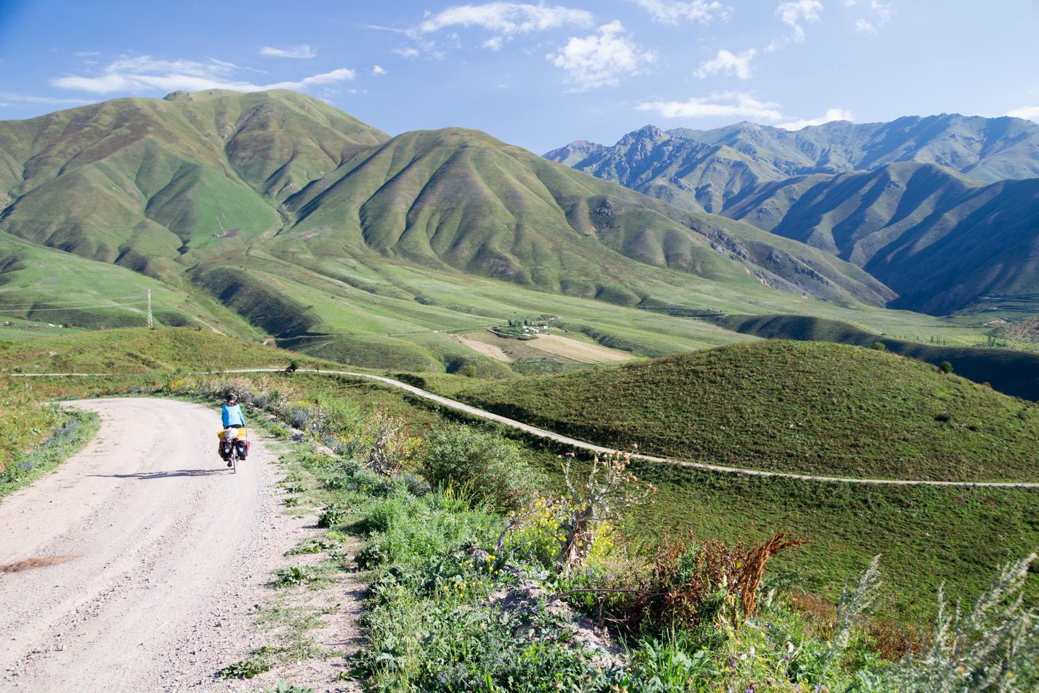 We have the alarm clock set for an early start today. The next hill was clearly visible from the high point yesterday. It looks like a beast and we want to tackle it before the sun gets too hot. We are able to ride most of it, just a couple of steeper and loose sections we walk. There are many yurts and temporary shelters along the roadside. Herders are grazing their livestock on the green hills and there are beehives everywhere. In about two hours we climb the 8km and about 500 meters vertical to the summit. At the top we are rewarded with nice views and a Kyrgyz sheepherder complete with traditional hat silhouetted against the sky. Nice photo opportunity. Looking back, we can see the Lake Tortugul.
