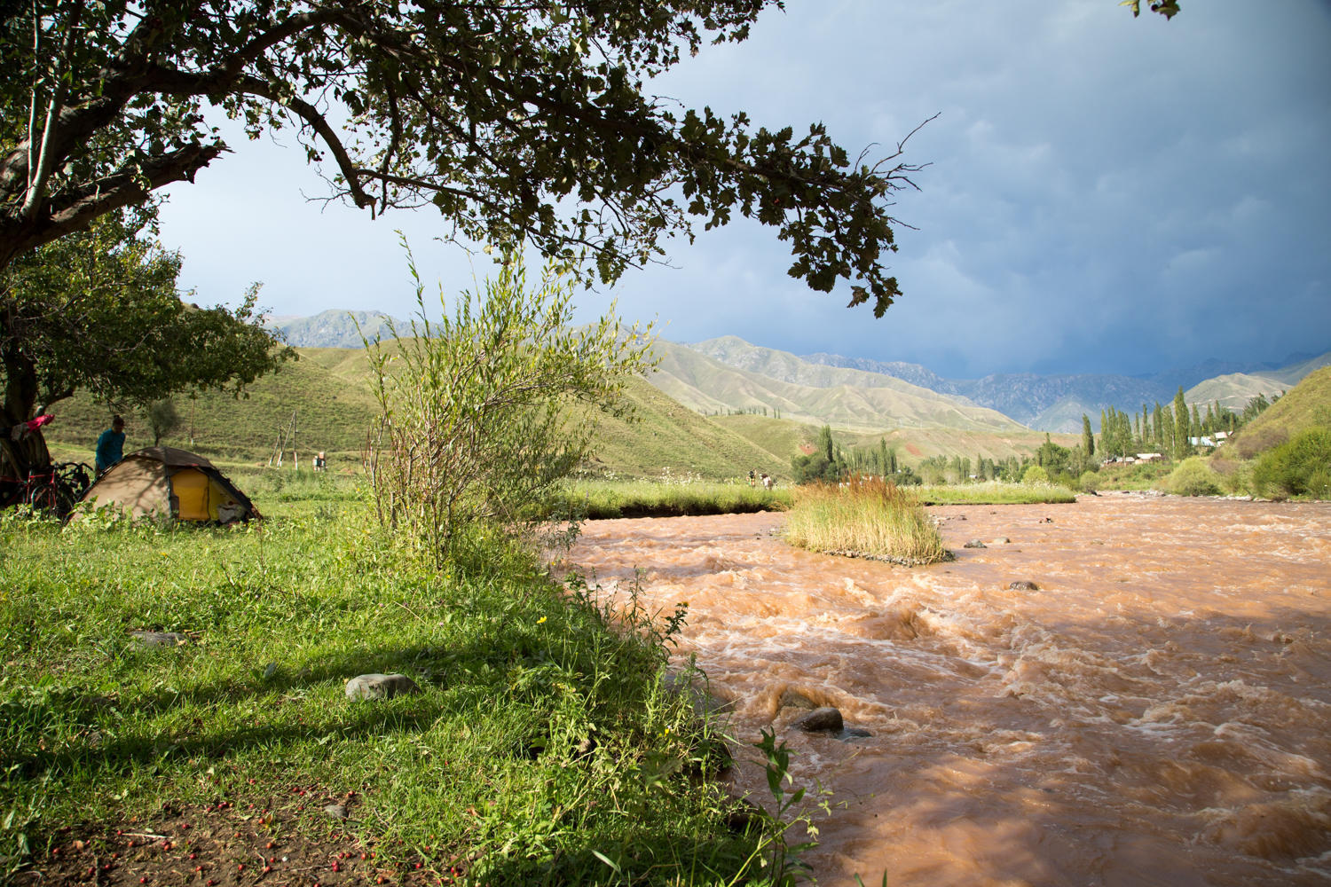 Just past the shops the road drops down steeply to the river. There is a large open field that appears to be used for the traditional Kyrgyz polo game played with a dead goat; there is a pile of car tires on each side of the field where you have to ride around with the goat to score. More important for us are the trees along the river under which we find some shade. There are some other people playing in the river, but they leave shortly after we arrive. We wash the tent to get rid of the cow smell and pitch just in time to see a huge thunderstorm come over the mountains. It hails hard and the clear river turns red. Good thing we already filtered water upon arrival.