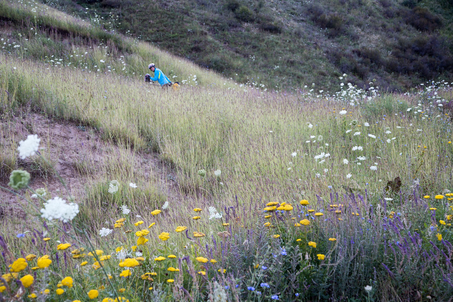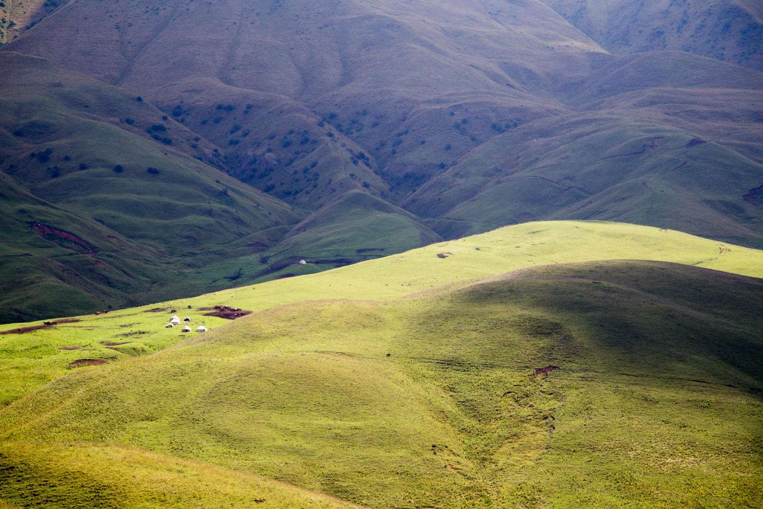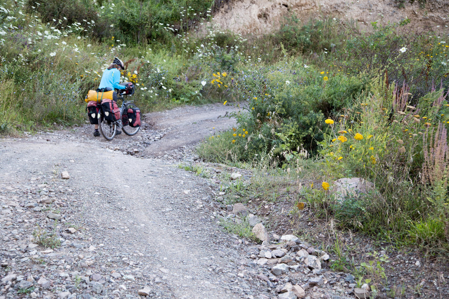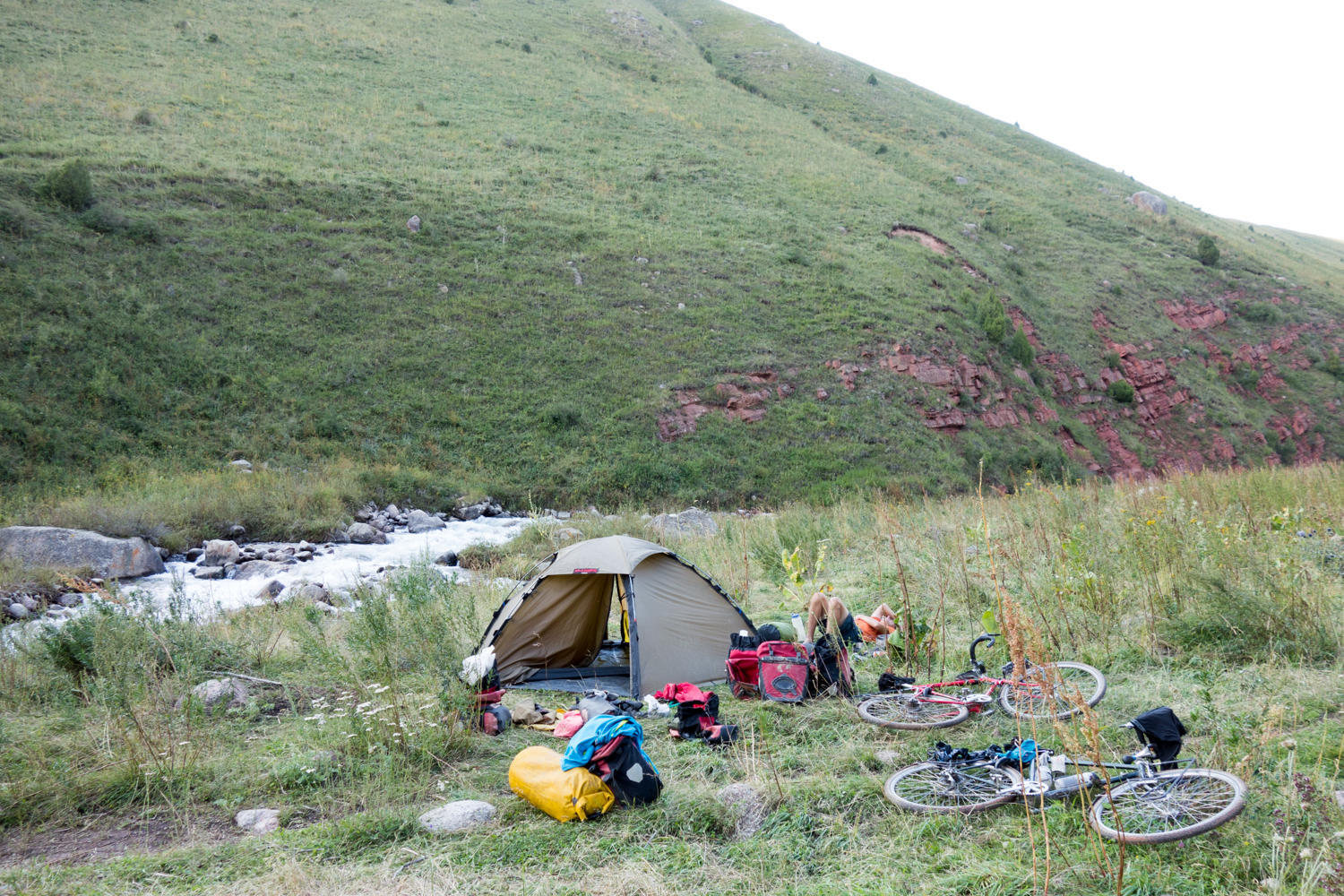 We walk most of the uphills, but the downhills are almost as tough; they are very steep with occasional deep ruts. We cross a big river, a potential camping spot, but there are many yurts and lots of kids. We decided to continue to the next river crossing where we find a nice secluded camp spot. This is not the actual “low” spot we had aimed for, but in hindsight it was a good choice because the next valley turns out to be steep with not much apparent camping opportunity.