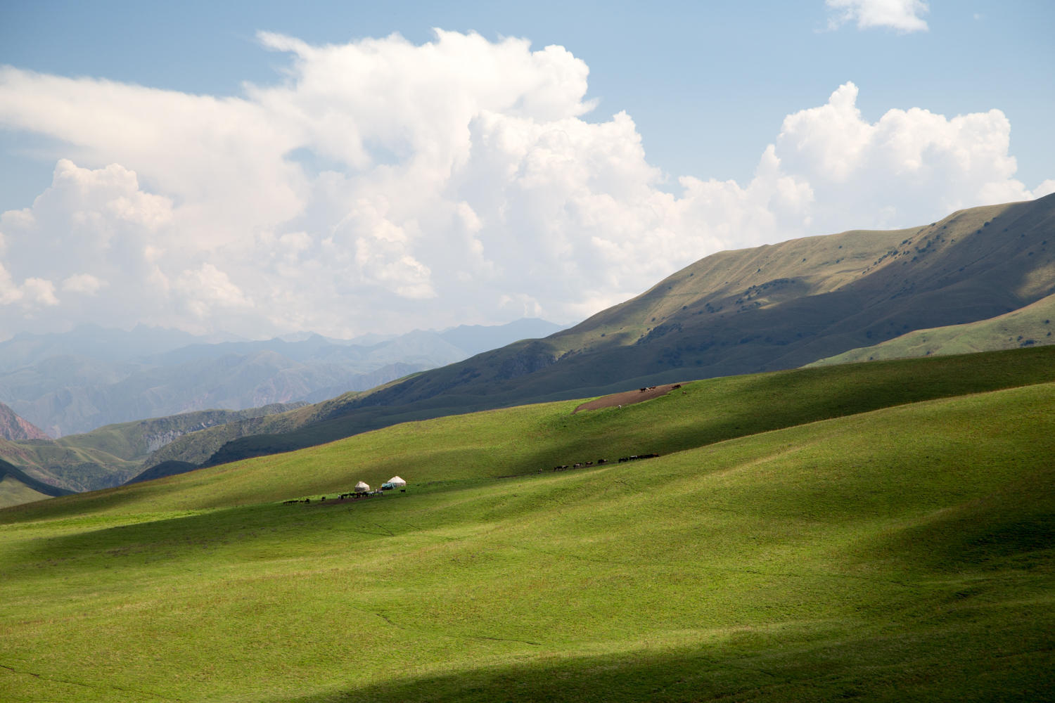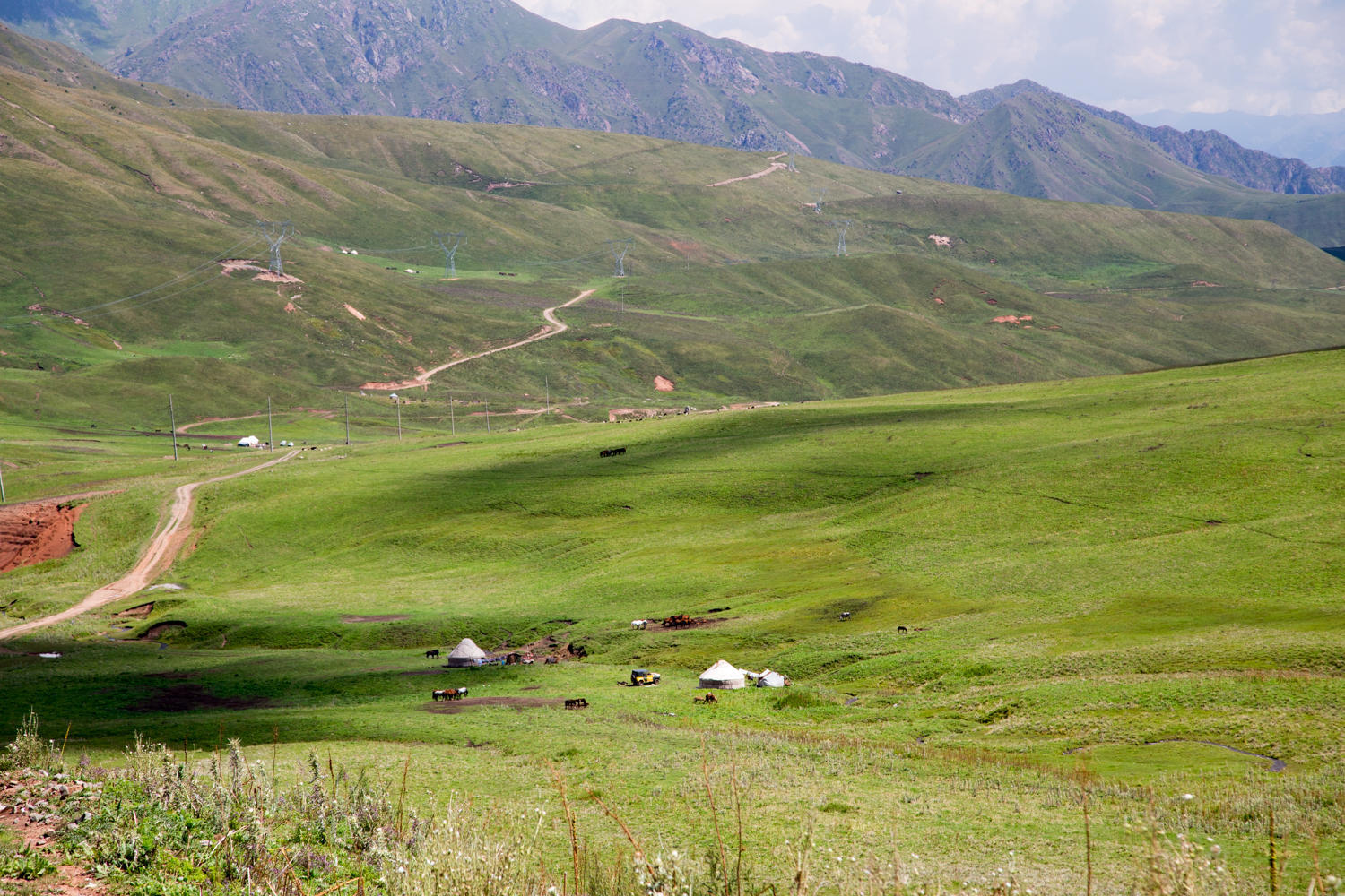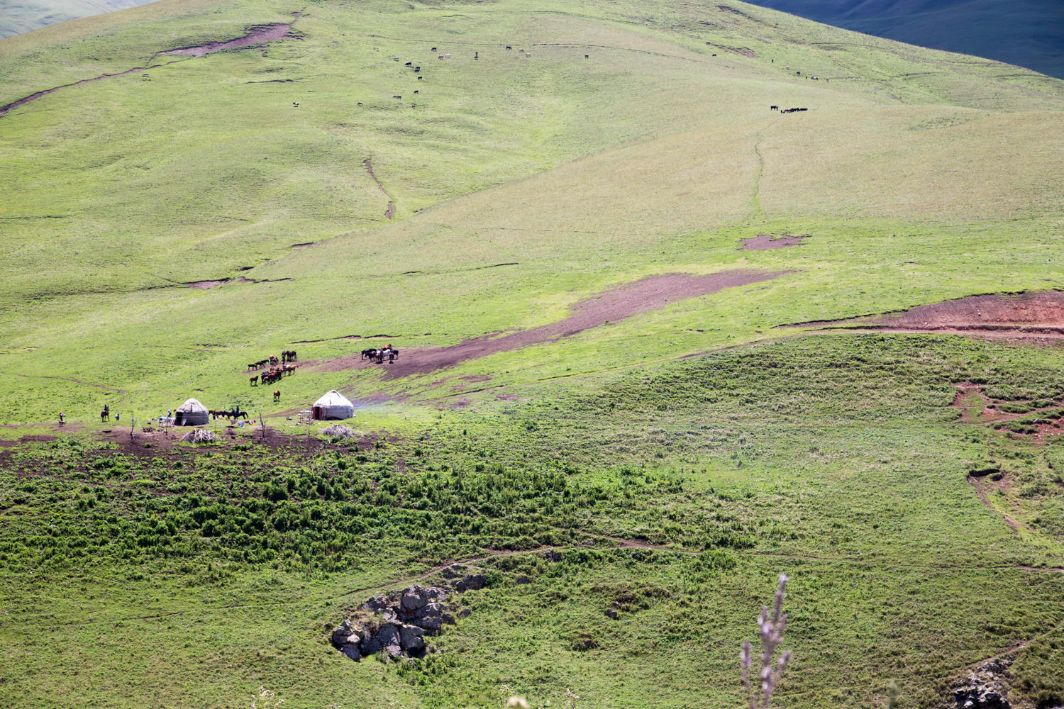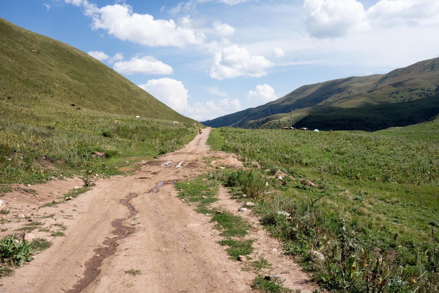 All around us are green rolling hills with plenty of yurts and livestock. The good thing about all these river crossing is that there is plenty of water, no need to carry much. The bad thing is all the ups and downs….. Even though this area looks deserted there are lots of people around, mostly on horseback or on donkeys. Very little traffic though.