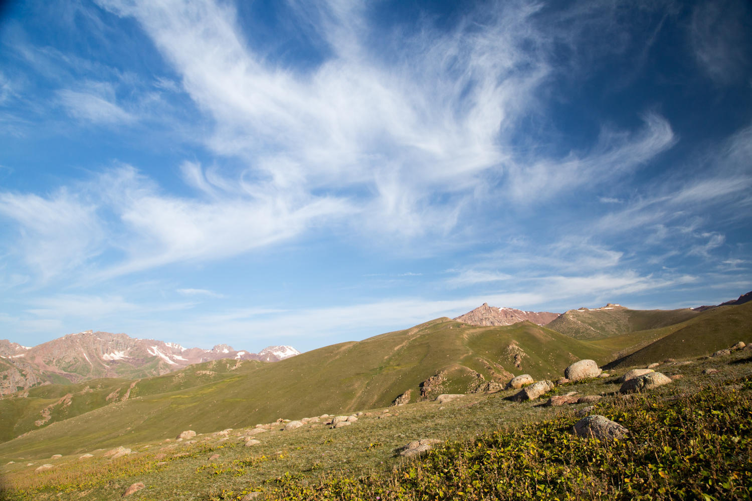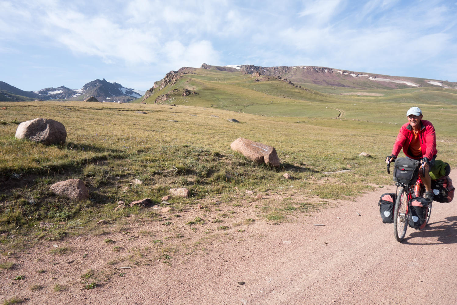 There are two summits to this pass, the first one slightly higher than the second, and in-between a short downhill. There are some yurts and lots of sheep and guys on horses. Nice campsites too along with plenty of mountain streams.
