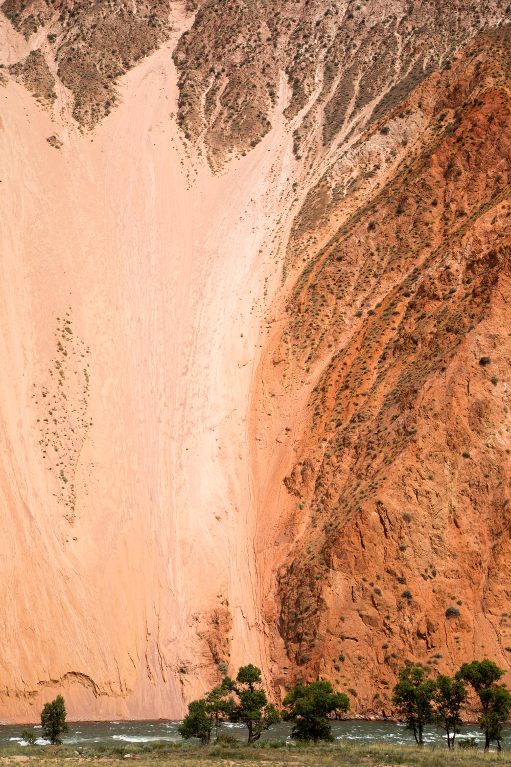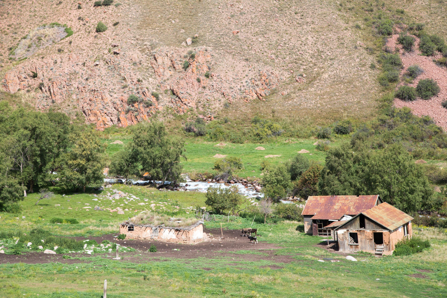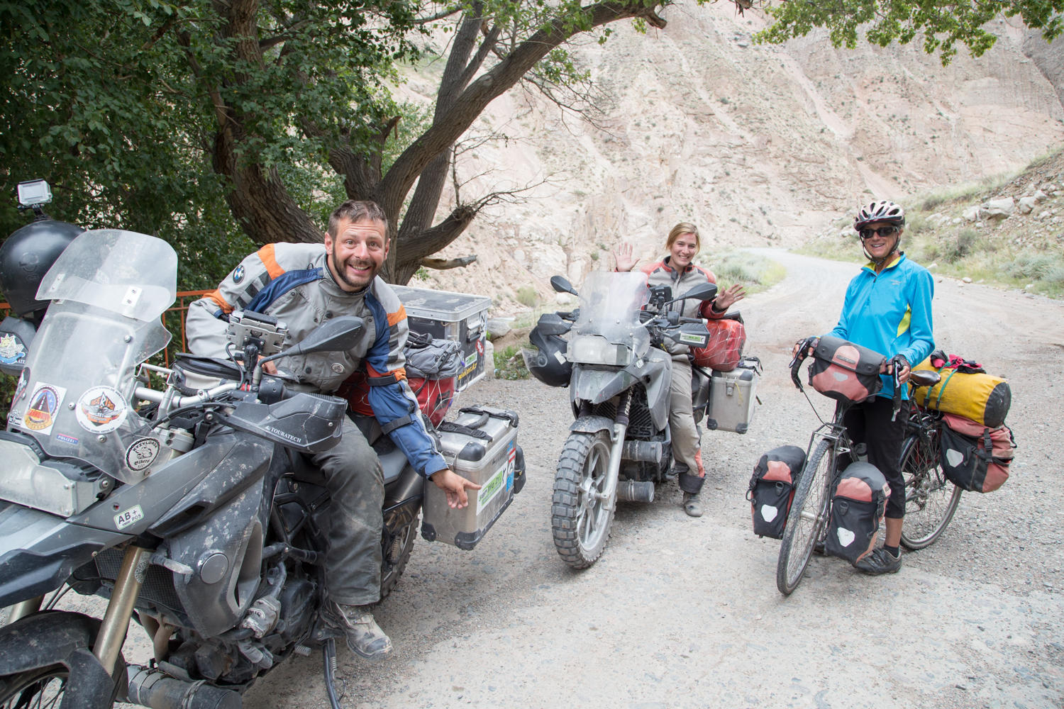 Our original plan was to go about 5km west to Kiezil Oy, a town which might, or might not have a guesthouse. We need a shower after bathing in rivers, lakes, mountain streams or irrigation ditches the past 12 days. But even more we need electricity to charge our tablet and netbook computer. The tablet is important for its GPS, the netbook is used to write our daily journal so we can copy and paste later into CGOAB. But we would have to come back these 5km tomorrow morning on our way east, and we hate to backtrack. Plus it is only 11:30 and Chaek is only 42 km away. Maps dot me shows a guesthouse and a homestay there…. So we head east, downstream along the river. We meet two Austrian motorcyclists, who camped and shared a bottle of vodka with Jo last night! Jo it seems is only a day ahead of us. Rumor is that the vodka made Jo jump into the river fully clothed….. We must get all the details later…….