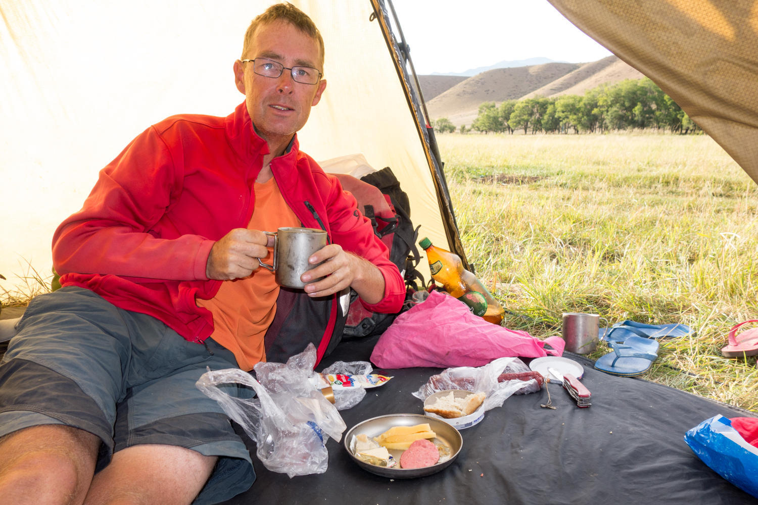 It starts to rain now so we pitch the rainfly and seek shelter. In Patrick’s opinion it does not make sense that most tents require you to pitch the inner tent first and then throw the rainfly over it. When pitching or taking down your tent in the rain you always get your inner tent and therefore the rest of your stuff wet. One of the reasons we chose our Hilleberg Staika is that the poles go in sleeves in the rainfly and you can pitch it first. So we sit under the rainfly and eat again a basic meal of salami, cheese and bread, but tonight we have a 1½ liter bottle of beer to supplement it!