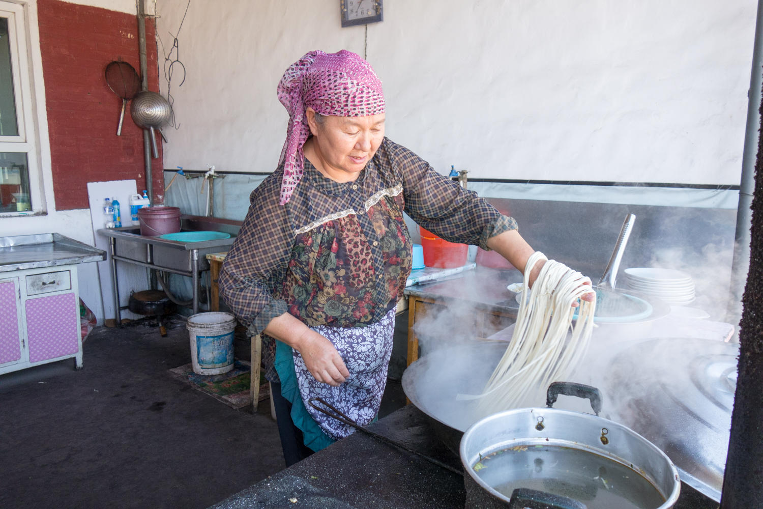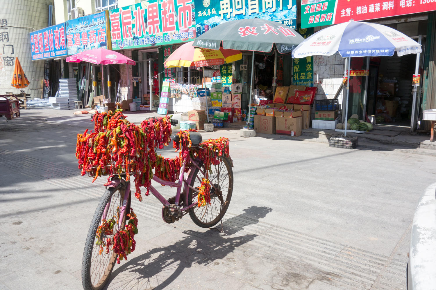 The corn fields are ready to harvest and those that have been harvested, we see heaps of corn scattered for drying on side roads. Red peppers are also piled in the fields for drying. At exit 686 we leave G30 for the last time. Just before entering Hutubi we stop at a roadside restaurant for a noodle dish. It is another Uighur run place with nice lagman noodles, and a meat, celery and tomato topping.