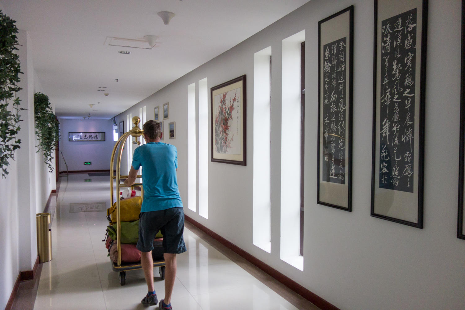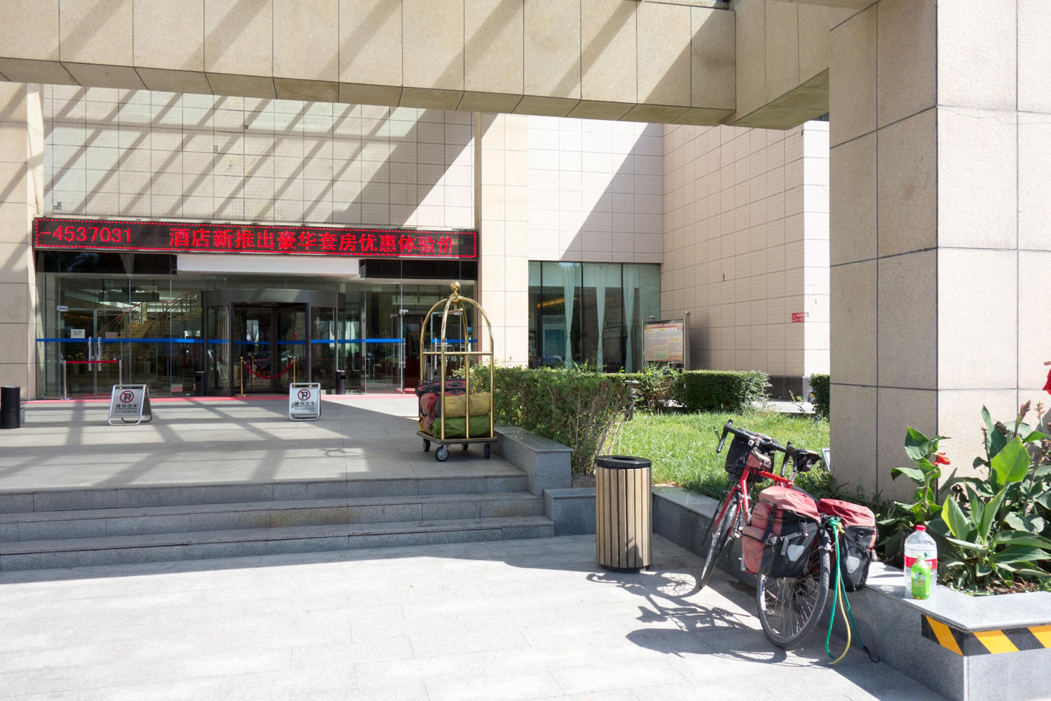 They direct us back a block, one man on a motorcycle to show us, to Holiday Wuyang. Thinking this might be out of our budget, pleasantly surprised they take foreigners at 265 yuan. A cart is brought to unload our luggage, bikes stored in the luggage room, and we are shown to our room. Large and very nice.