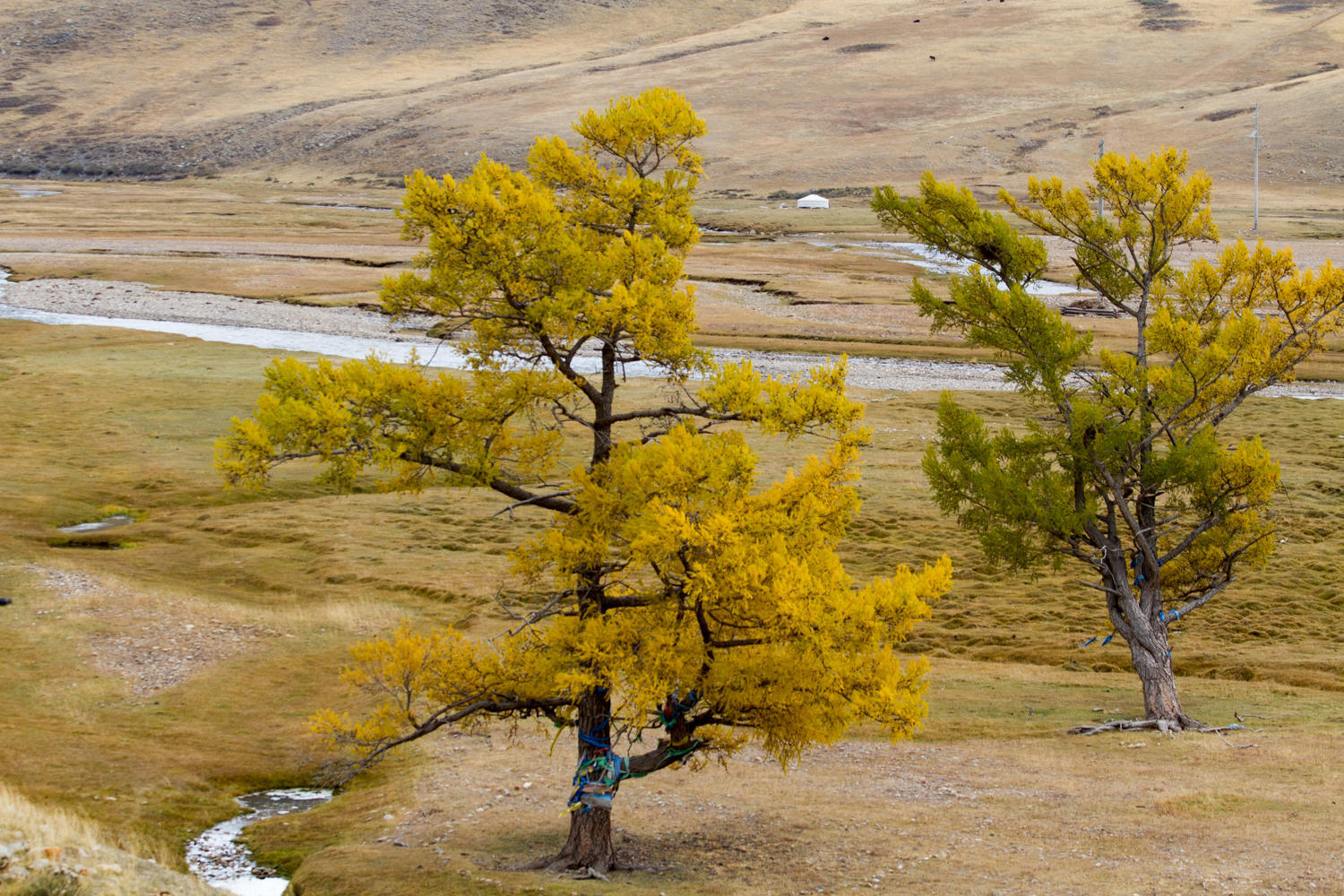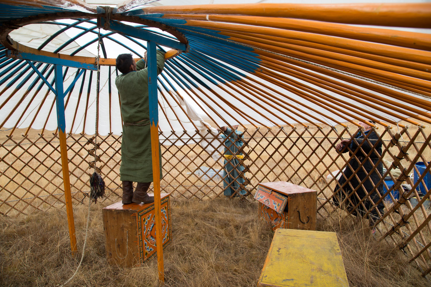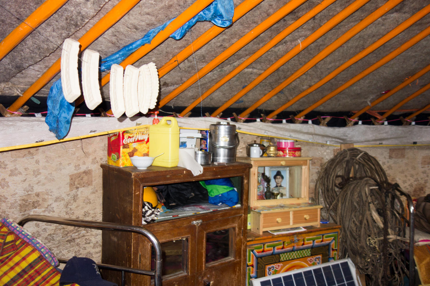 Around the perimeter of the ger are three beds set up, plus most of the floor is covered with thick carpets. Nobody takes their boots off going in and out so the floor is not that clean. There are carpets on the floor, the ones near the door appear to be the ones to catch most of the dirt from shoes. There is a stove in the center, and a cabinet near the door with cooking utensils strung above it, and is the cooking area. Along another section are a couple of colorfully painted wooden cabinets and a shrine to what looks like a family patriarch. There is a rope with spiritual significance hanging from the center of the wheel that is the center of the ceiling to the side of the ger. From the rope hangs a blue silk scarf and yak and horse hair.