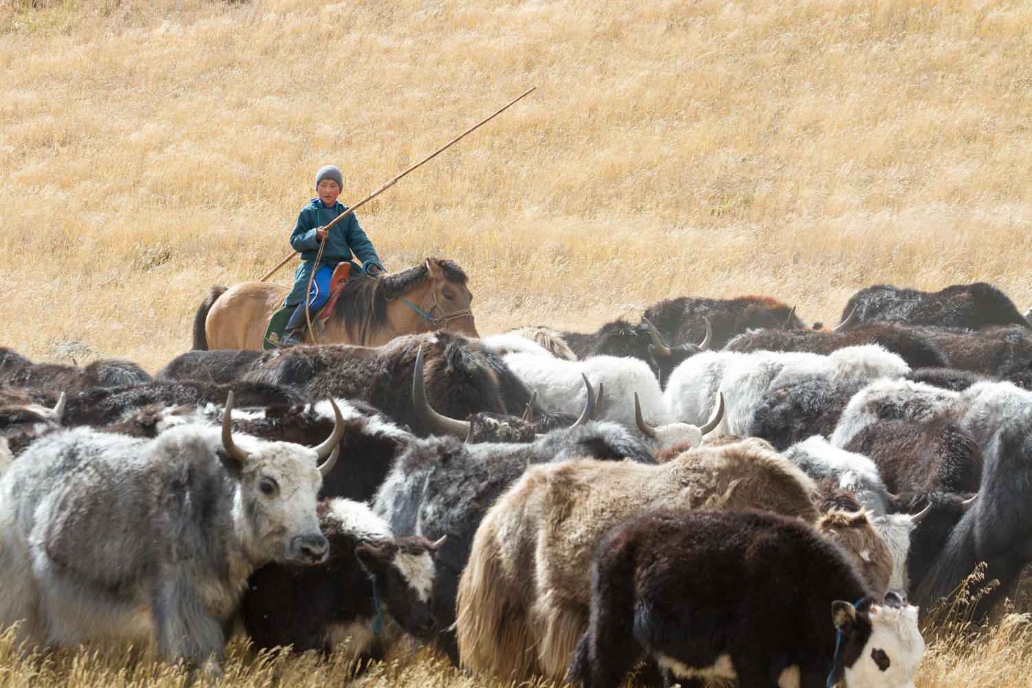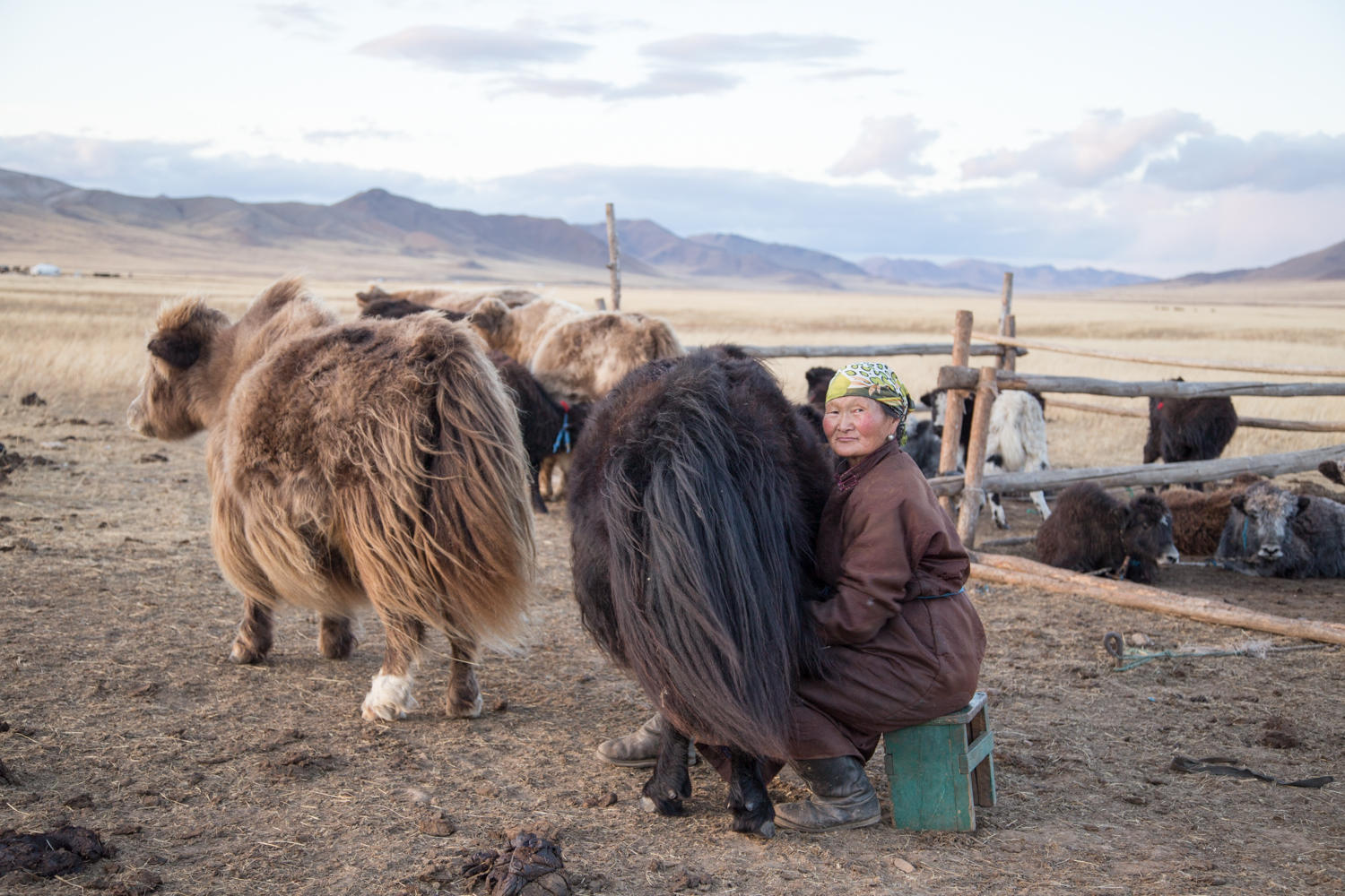 Just before sunset the adult yaks arrive home. They are kept separated from the calves, in the morning the herd of adult yaks is driven off in one direction and the calves in another. In the evening the calves are brought back first and tied up. Then they locate the main herd by driving their motorbikes or horses and drive the herd back. The mother yaks are eager to feed their young, but first they are partially milked by the women of the family. It is a cold and windy out there and until after dark the women go from one yak to the other to milk them. Once they have taken some milk they release the young and let them feed too.