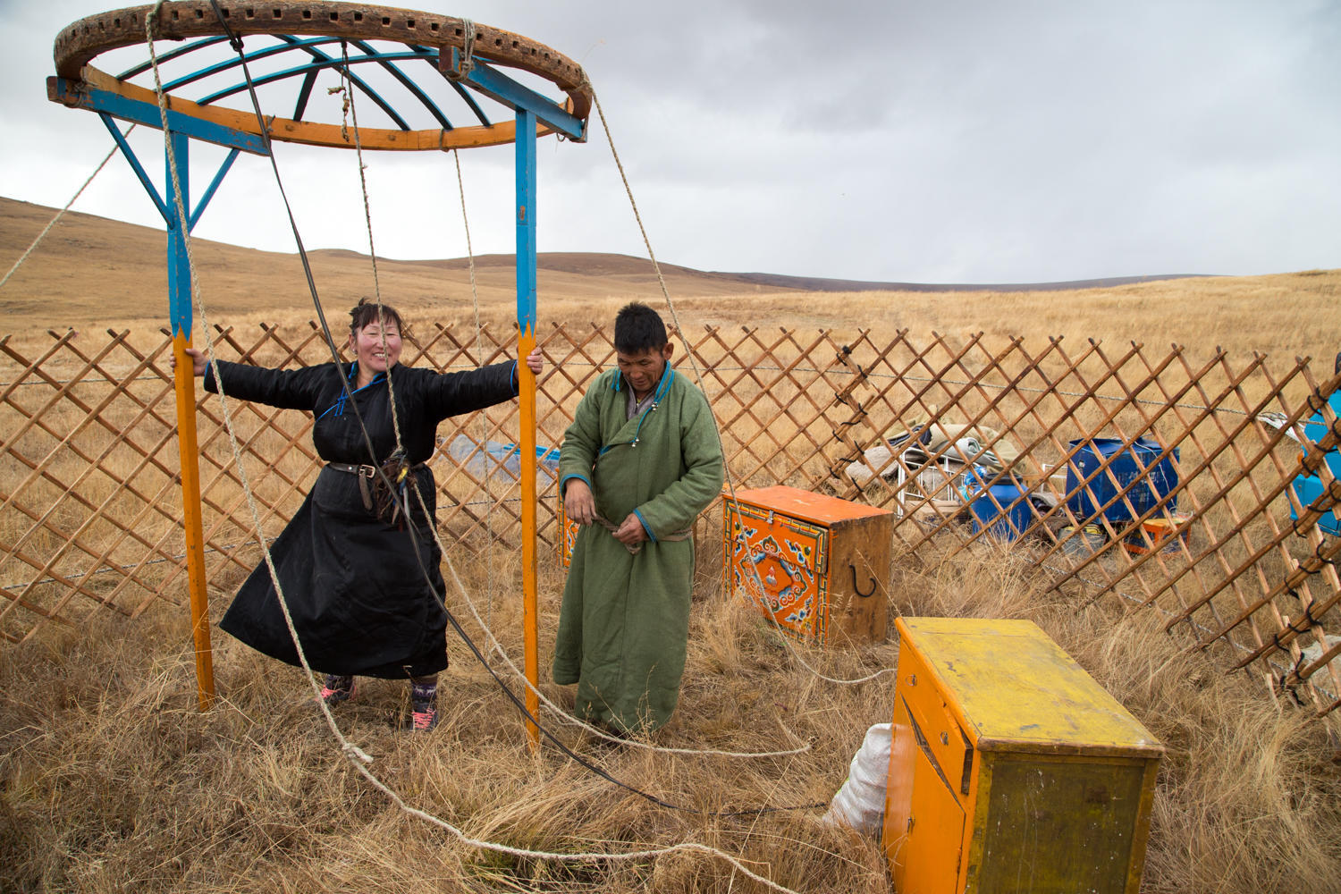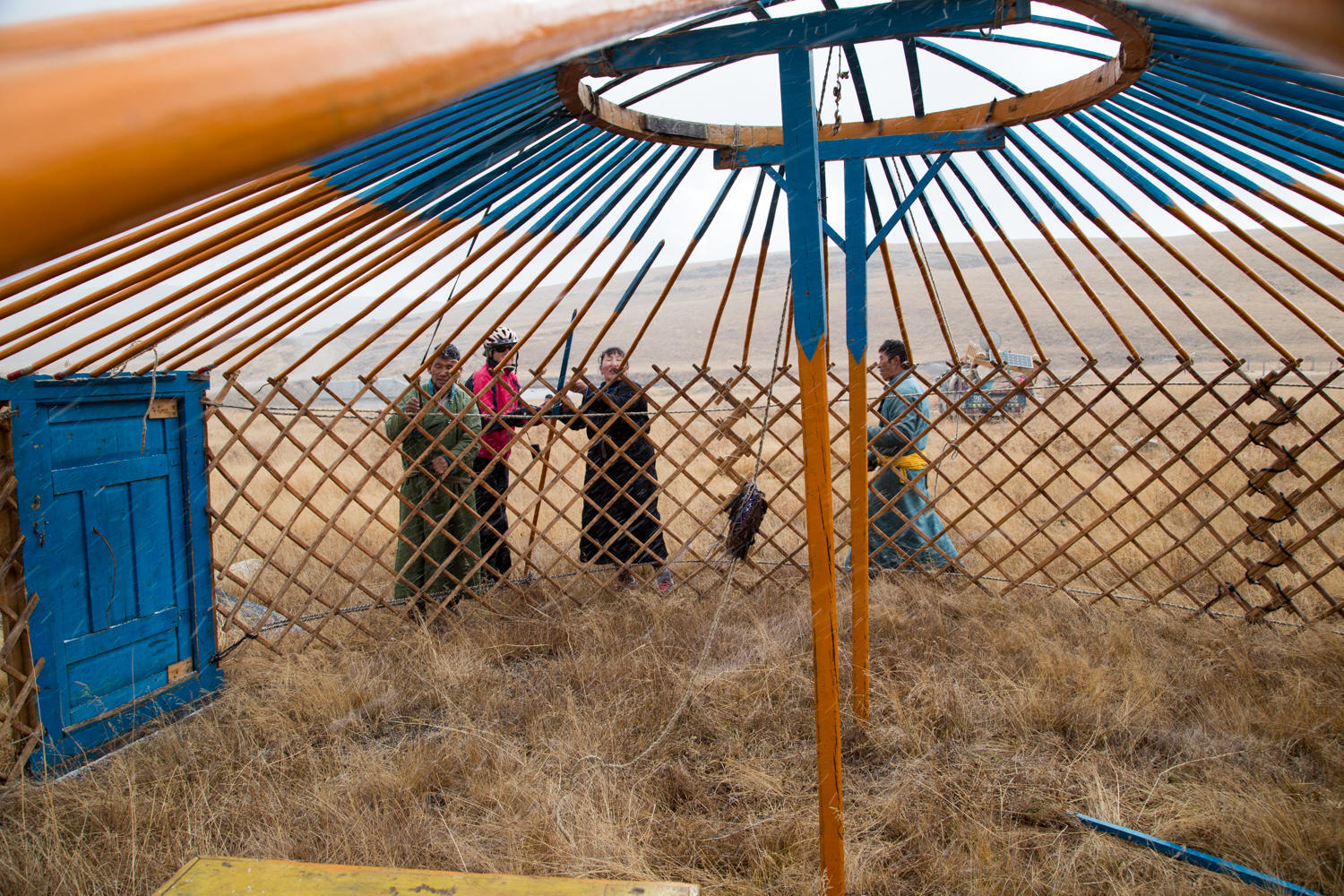 First a lattice fence, about 5 feet high is bent in a circle starting and ending at a wooden door frame and door. Then in the middle the wooden round center point is raised up on two tall wooden poles. From the center point long sticks are run to the lattice fence and fastened with strings. Two long ropes run around the outside of the lattice and pull everything together. After the frame is set they put heavy felt tarps around and on top of the frame. Ropes on the tarps are tied around the ger so everything works together to make a relatively lightweight, flexible but very strong shelter. We help them for about an hour and we think it will probably be done in another hour. They give us milk tea, we add some cookies and little cakes to the mix.