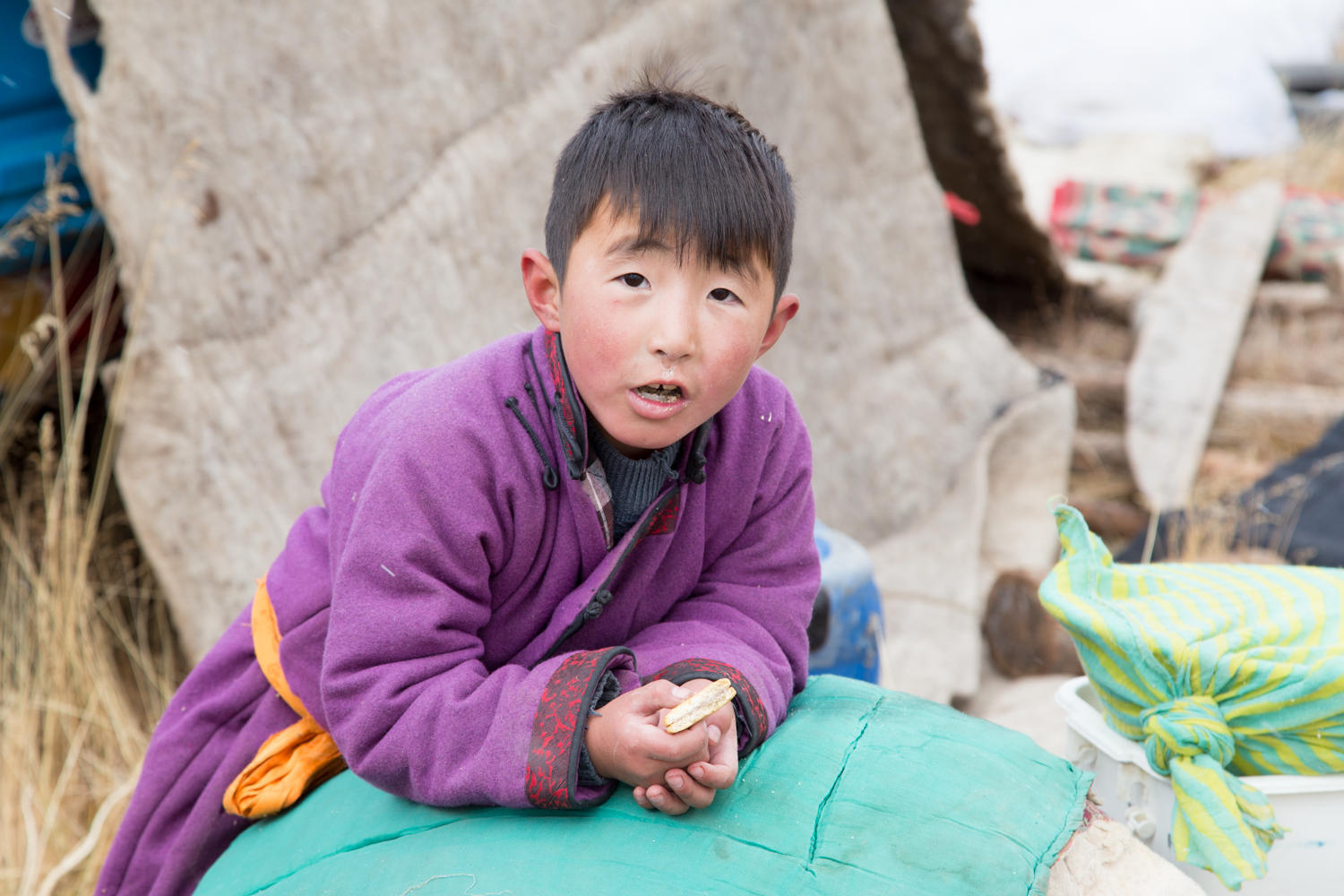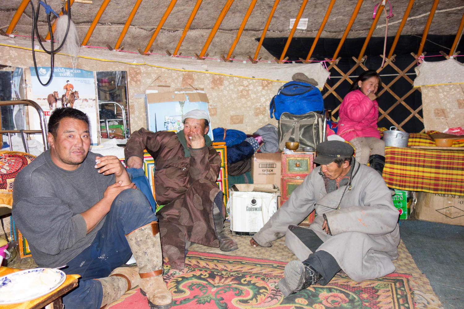 It appears we are invited to sleep on the floor, but we will be sharing the ger with the rest of the family. Even though it is warm and cozy in here we doubt we would get much sleep with so many people, so we pitch our tent next to the ger while Pierre sleeps inside.