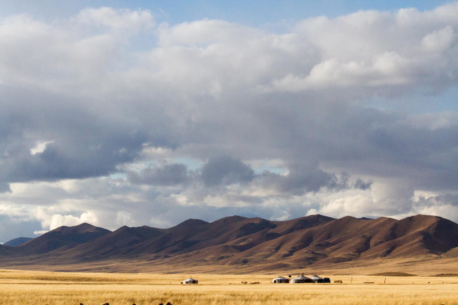 We need to climb about 50 kilometers to cross a 2500 meter high pass, an altitude gain of about 700 meters from Uliastai. There are a couple of steep sections, but overall it is a nice climb. The clouds are getting very dark though, it sleets on us a couple of times but we avoid the worst by having some of the blackest clouds just ahead or behind us.