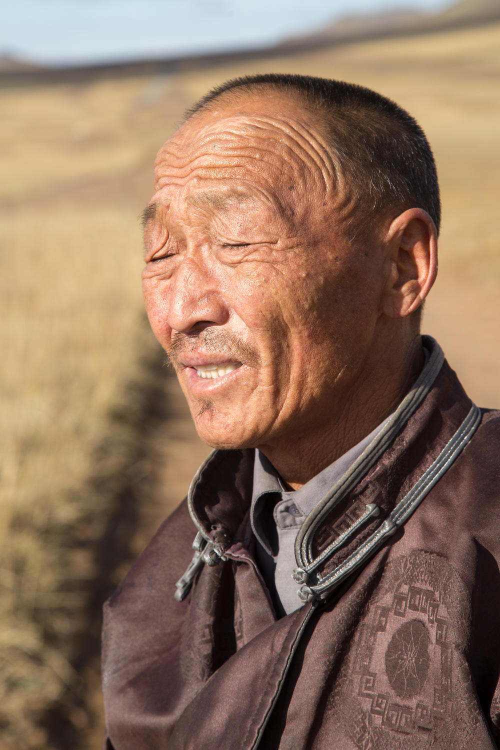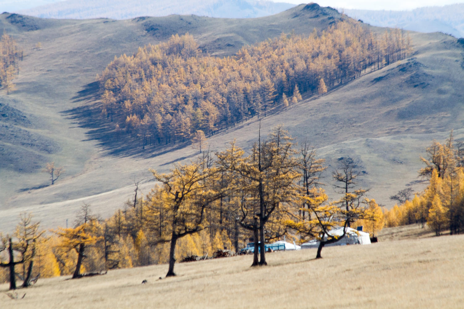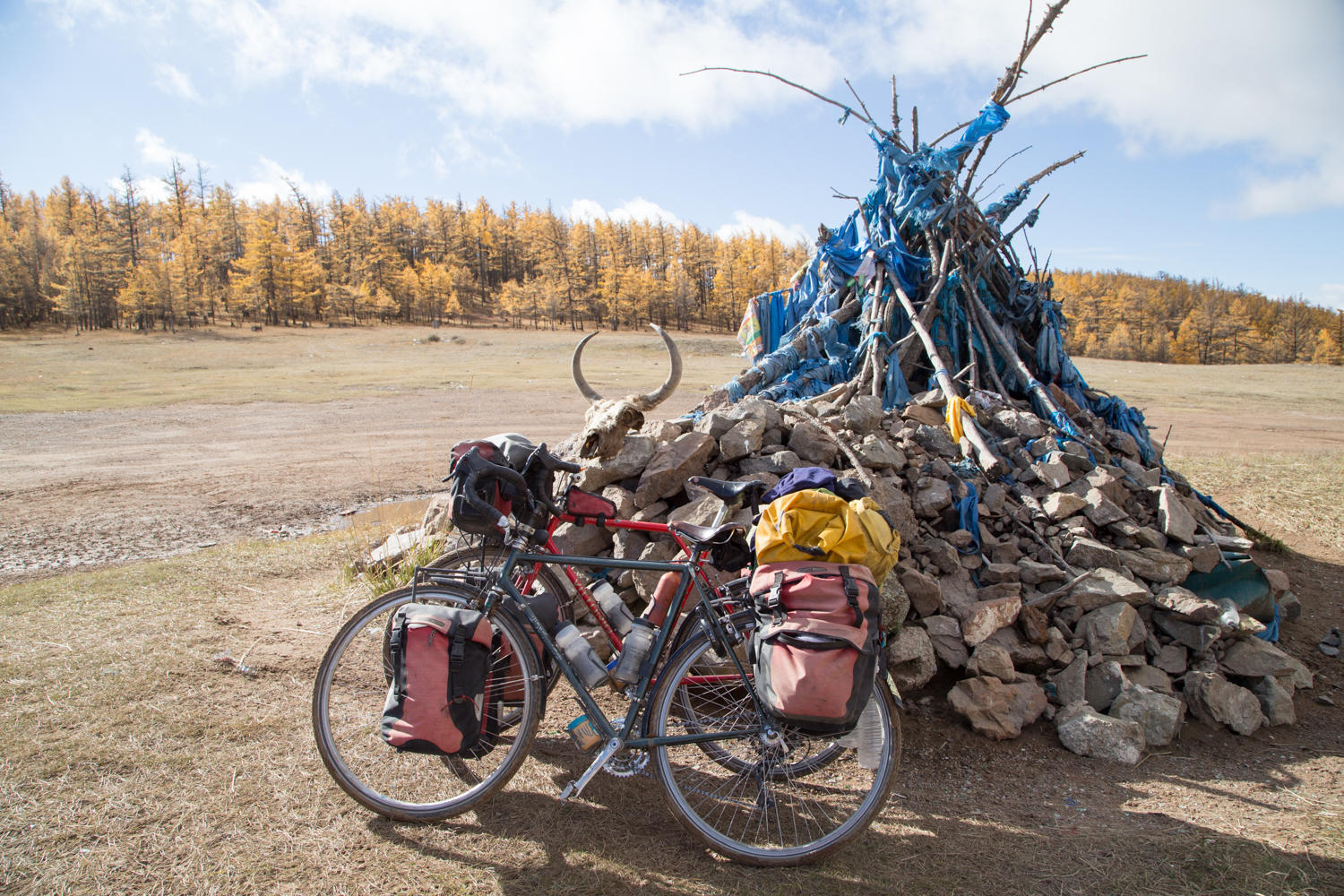 The climb is only supposed to be about 200 meters altitude gain, but we are both struggling to get up it. There are a couple of dips to deep gullies with very steep banks. But eventually we reach the Oovoo at the summit. The light is still beautiful, on the oovoo with blue khota scarfs, a yak skull complete with horns and yellow larch trees on the hills. It is also getting cloudier with rain threatening.