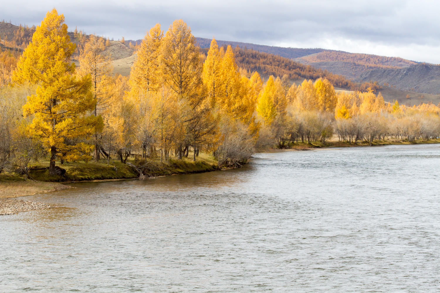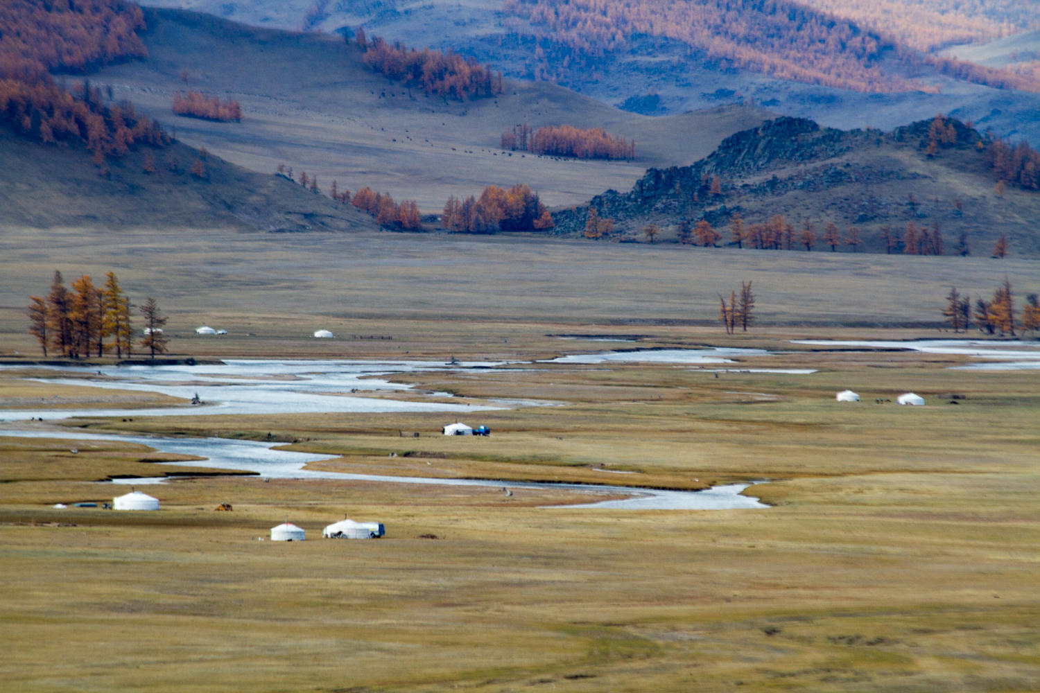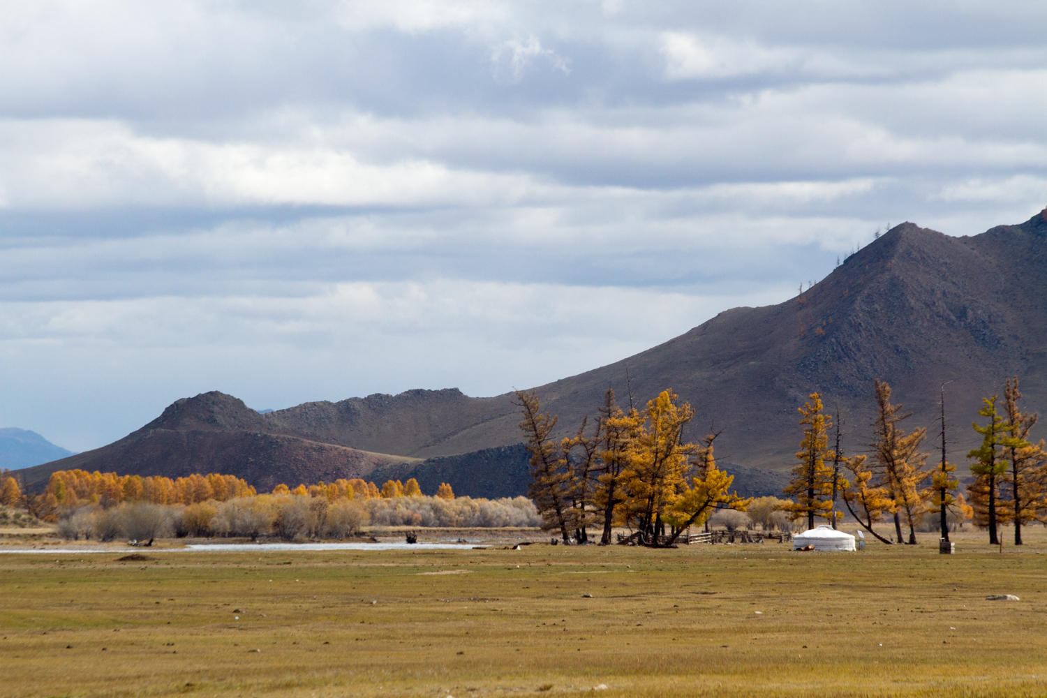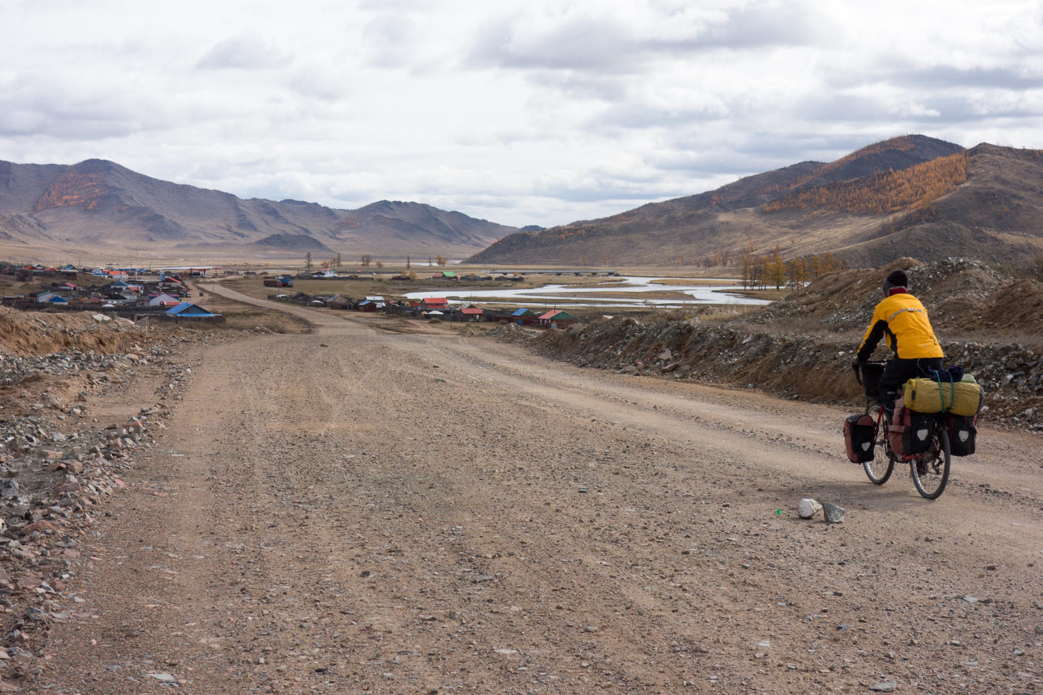 We get to enjoy this smooth asphalt for about 30 kilometers down a beautiful valley with hill sides covered in fall-colored larch trees. There are Gers, yaks, sheep and goats everywhere. A light tailwind helps us on our way. Then a brief reality check, probably just to make us appreciate the asphalt even more, the road turns to bumpy corrugated gravel. Oh no! Pavement or dirt makes a big difference on how far we can go in a day. Our plan is to try and reach Tsetserleg in five days, there is no way we can do that on dirt or rough gravel like this. Four kilometers further it blissfully returns to asphalt. We pass the small town of Ikh-Uul and cross over to the north side of the river. This section of the road is especially beautiful with groves of larch trees along the river.