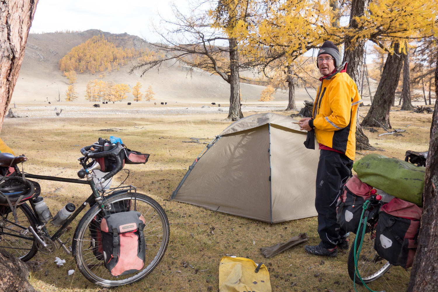 After 54 kilometers the road turns abruptly south, leaving the main river and following a tributary upstream. We have to gain about 800 meters to a 2600 meter high pass. We would like to get some of the meters climbed today, but a strong headwind is making the going tough. From about 10 kilometers out we spot a potential campsite: another bright yellow grove of larch trees on the valley floor. We push on and get there at about 4:30. A nice spot among the trees with a river nearby and grazing yaks all around. We set-up camp, eat and call it a day. If the weather were nicer this would be a good spot for a campfire with plenty of downed wood around, but on a blustery cold evening like this the sleeping bag is a lot more inviting.