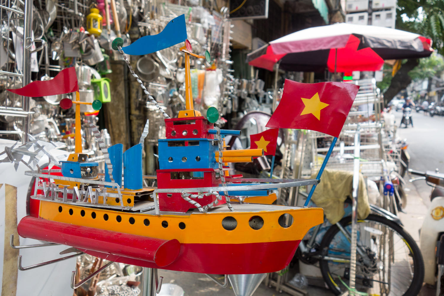 Day two is spent organizing our tour to Halong Bay and wandering the streets. It's a spider maze of streets, mopeds speeding by or parked on the sidewalks, pedestrians, bicycle rickshaws and small golf cart-like tourist buses advertising "green tourism". All the streets look alike and the names seem similar until looking closely. Streets still have stores clumped together with like products...first we walk down the "button and zipper" section then past the "hardware"section of streets, the Walking street is where there are lots of sidewalk eateries. Crossing the street, we are back to weaving our way across the traffic from each direction.