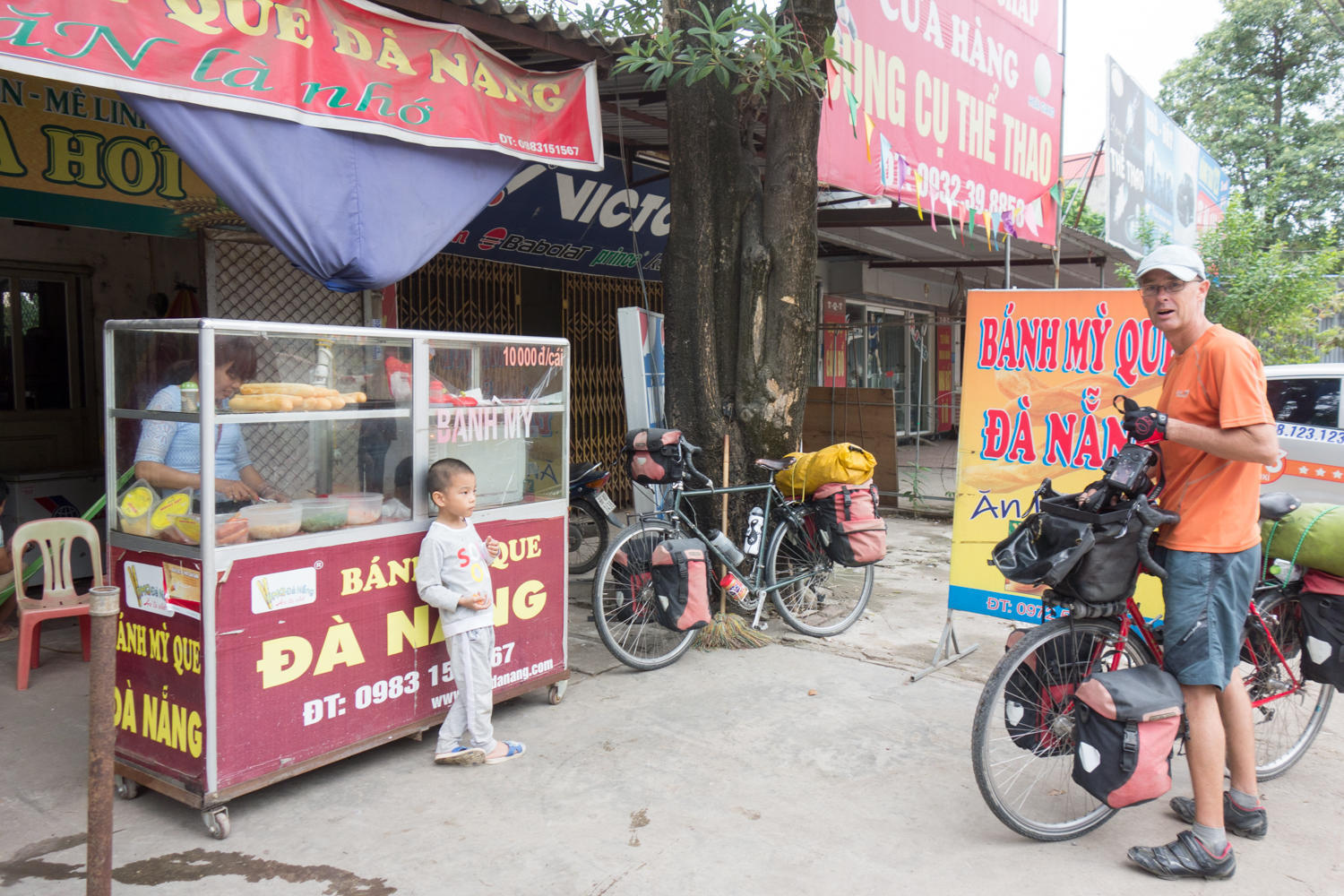 "I'm ready for a Pho Bo" Patrick says. We have had iced coffee waiting for the Hanoi Bicycle Collective to open and then after 20kms stopped for a Banh My sandwich. Cycling in Vietnam is terrific for roadside eating.