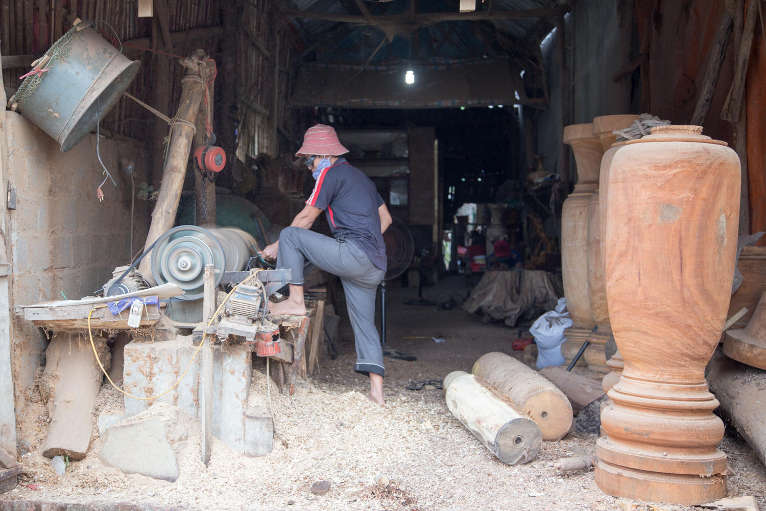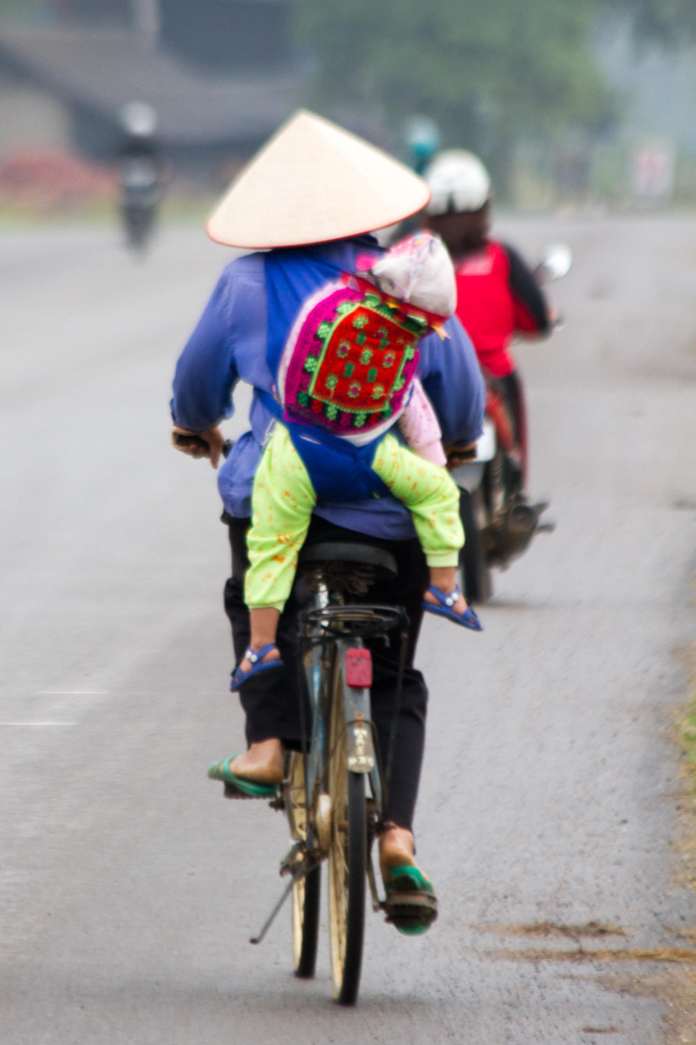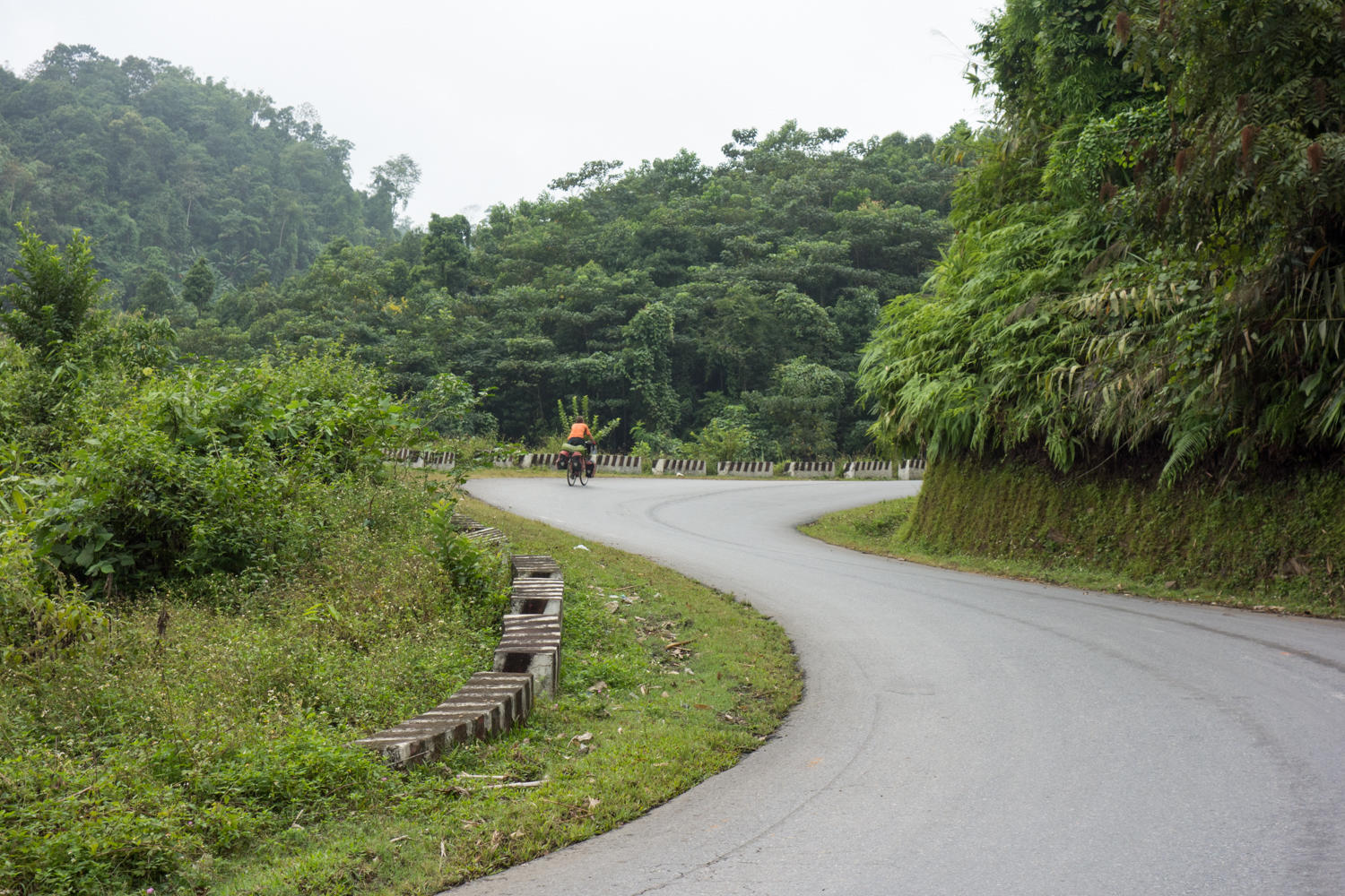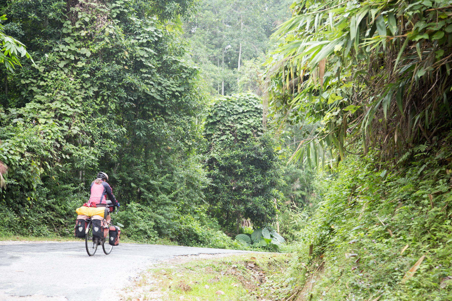 After about 30 km we turn off onto a smaller road and lose most of the traffic. The road is narrower, but there is not much traffic. We are continuing to climb and lots of ups and downs and a few steeper climbs. Everything is so green and so much to see of daily life as we ride by. We start seeing the tradition wooden houses on stilts that the people of this region live in. There are rice paddies, huge bamboo groves and every inch is covered in green foliage.