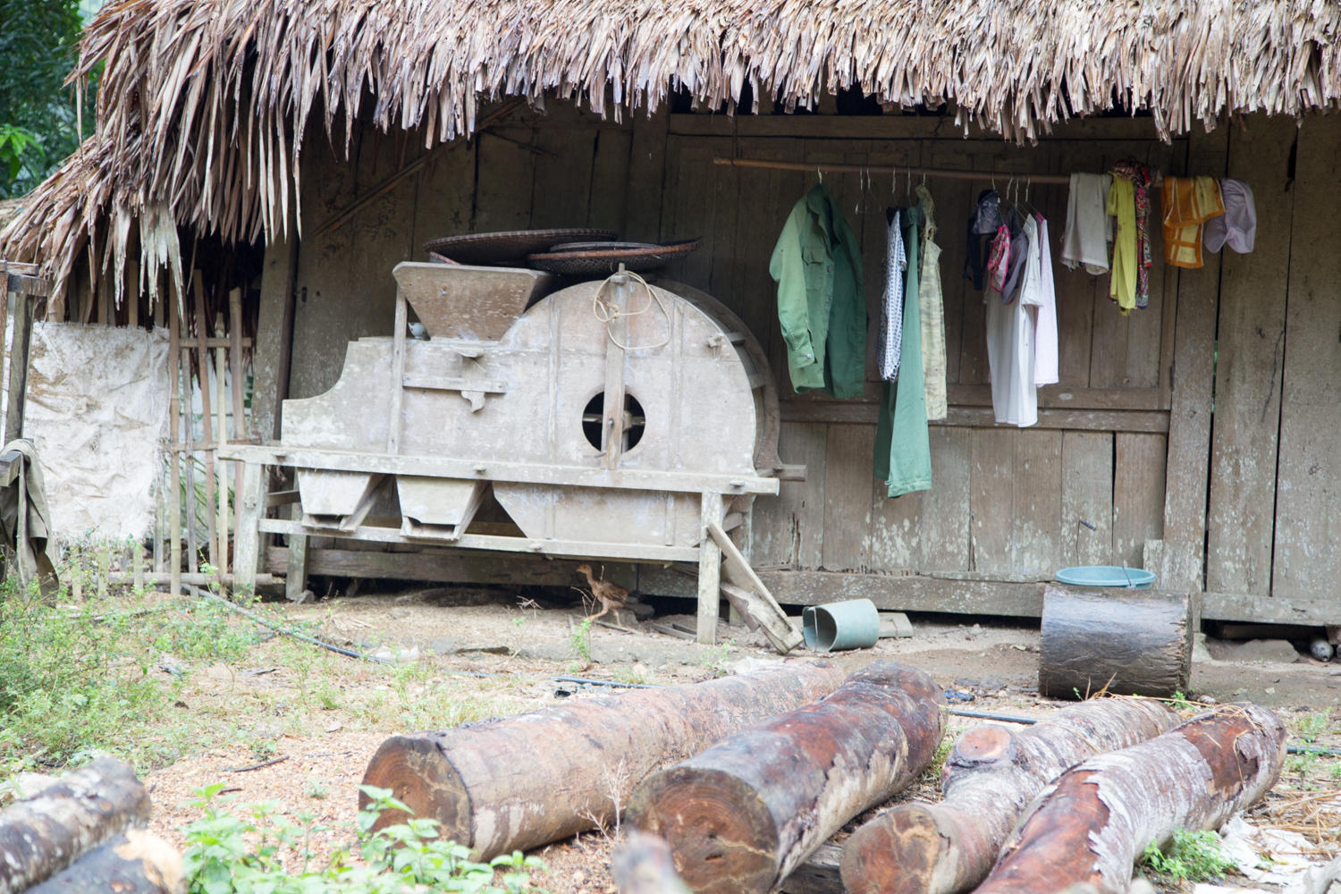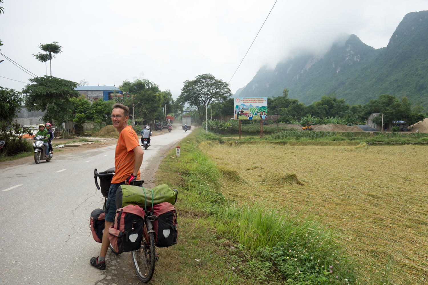 Our goal is Bang Lung, it seems like a good sized town on goolemaps. As we get closer though the road deteriorates to a one lane strip of asphalt full of potholes and mud. We make it there just before the rain starts to come down hard. We find a nice guesthouse, again a 200,000 Dong room (about US$8) with wifi, hot shower and a couple of restaurants across the road.
