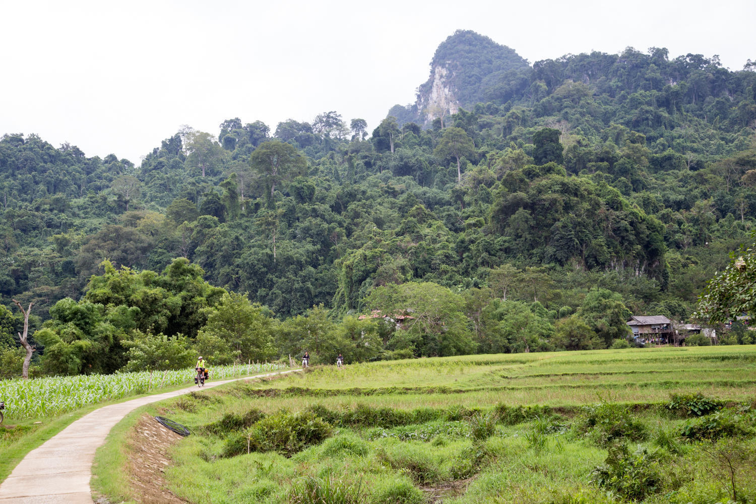 Just before we reach the national park there is one more good sized town where we pick-up some bread, just in case. One more good hill to the park entrance. There is a gate and we expect to pay an entrance fee. But the ranger seems a bit confused and waves us through. On the downhill we meet a group of backpackers who bought mopeds and are touring the north of Vietnam. They give us directions to Mr. Linh's place, but you can't really miss the large roadside sign they have put up.