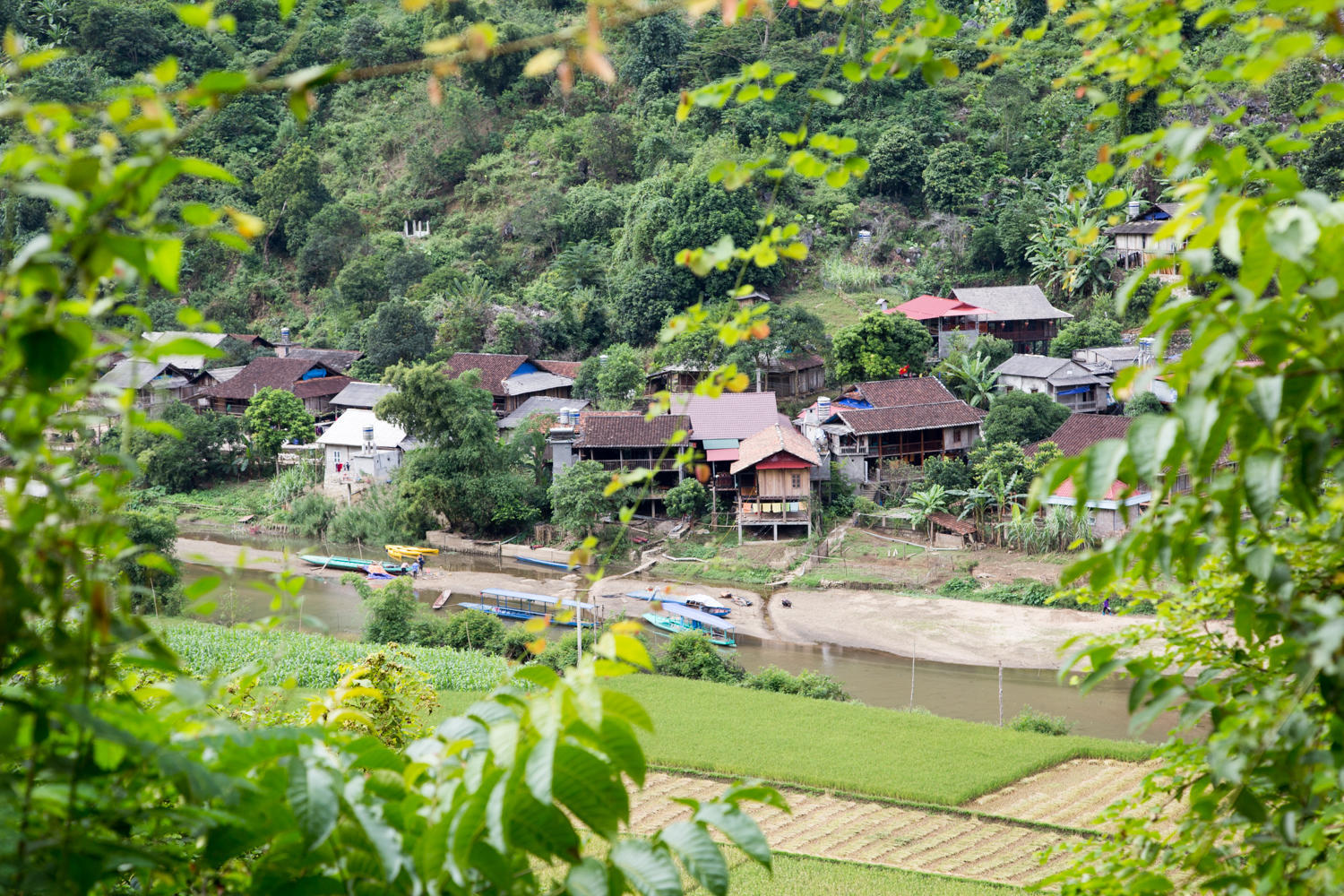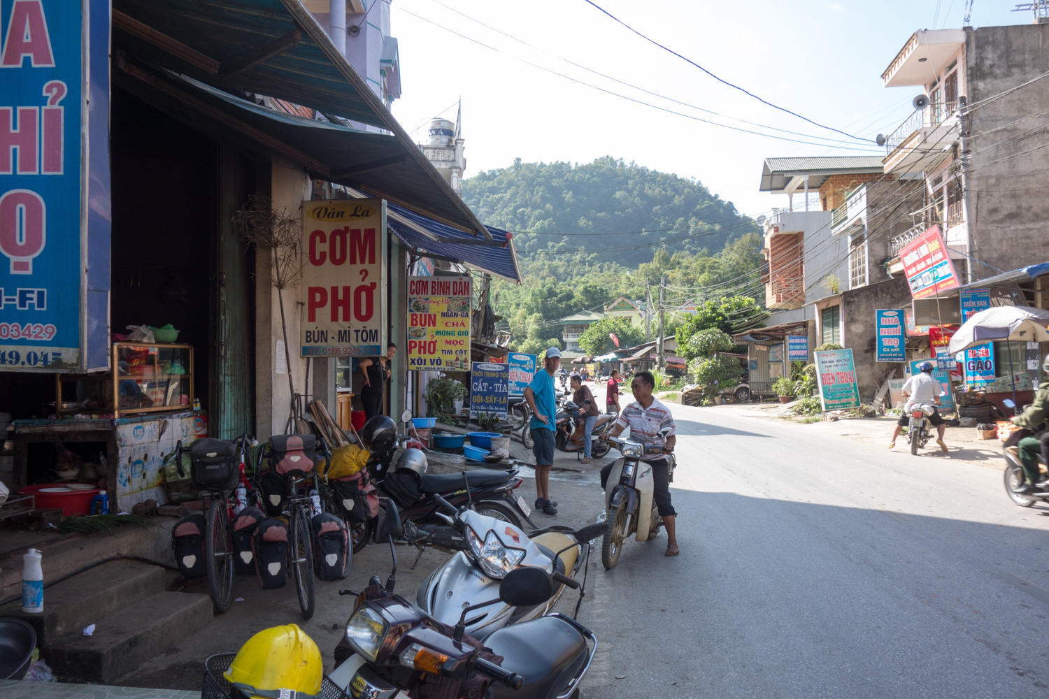Mr. Linh, or the guy that owns the place, ensured us there is a guesthouse there. Guess what: there is not. It is a small place with several restaurants that all seem to be out of food today. We are told there is a guesthouse ten kilometers to the south in Na Phac. The road follows a river and is fairly flat, so backtracking tomorrow will not be as bad as it could have been. It is very scenic though. in retrospect, staying later at Mr. Linh and a short day to Cho Ra would also have worked distance wise for tomorrow.
