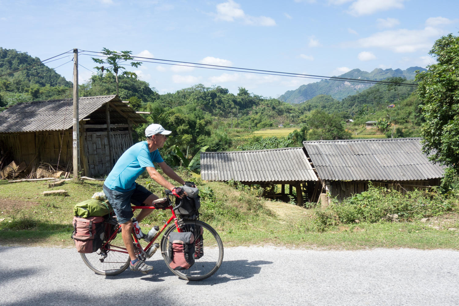 We set off from the Guesthouse after another great breakfast. We could have taken a long boat across the lake saving us 10 km and some hills but we choose to continue riding around the lake. We go through Pac Ngoi with many homestays and shops. We buy some tangerines and choco-pies. We have seen choco-pies all through India, Nepal, the Pamirs and Mongolia.