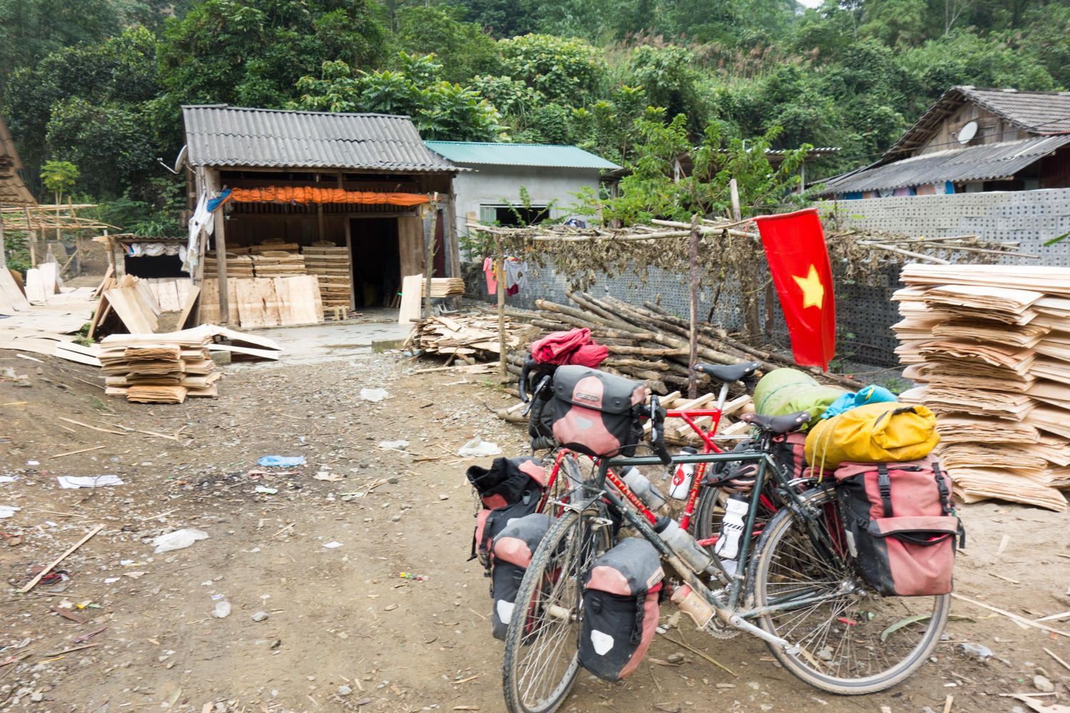 The day went quickly, a few good hills. Riding through towns about the time school is out, kids flood the street riding bikes and of course a few have to race us up the hills. It rains a little early on in the ride, but later the sun breaks through and makes it even muggier. Our plan was to take a "short-cut" ride on the white road towards Lao Cai, but the main road we are on has a good surface, not too much traffic and minor hills in the tail end. The last couple of kilometers the road follows a river with China on the other side.