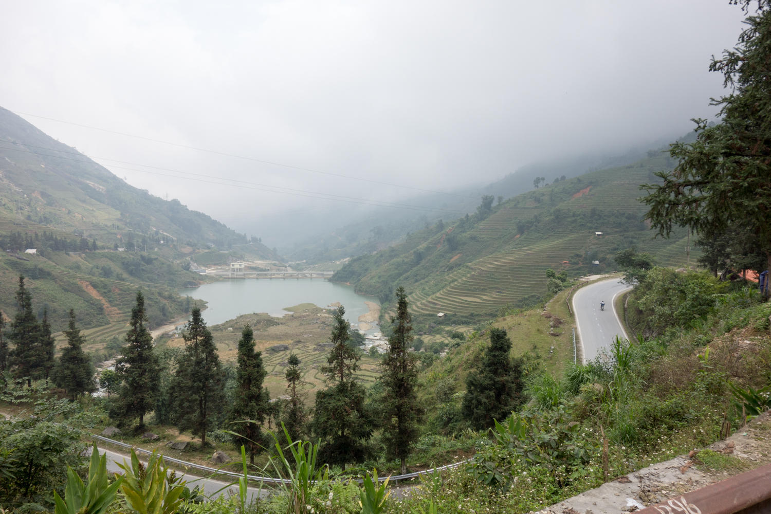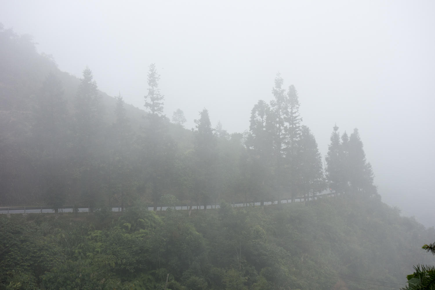 Up early, we head back to the Pineapple Restaurant for breakfast of omelet and banana pancake. The sky is overcast and as we ride and start the climb, the hills are fogged in.