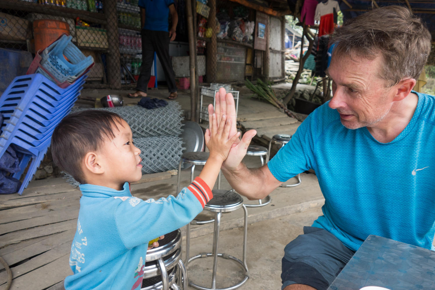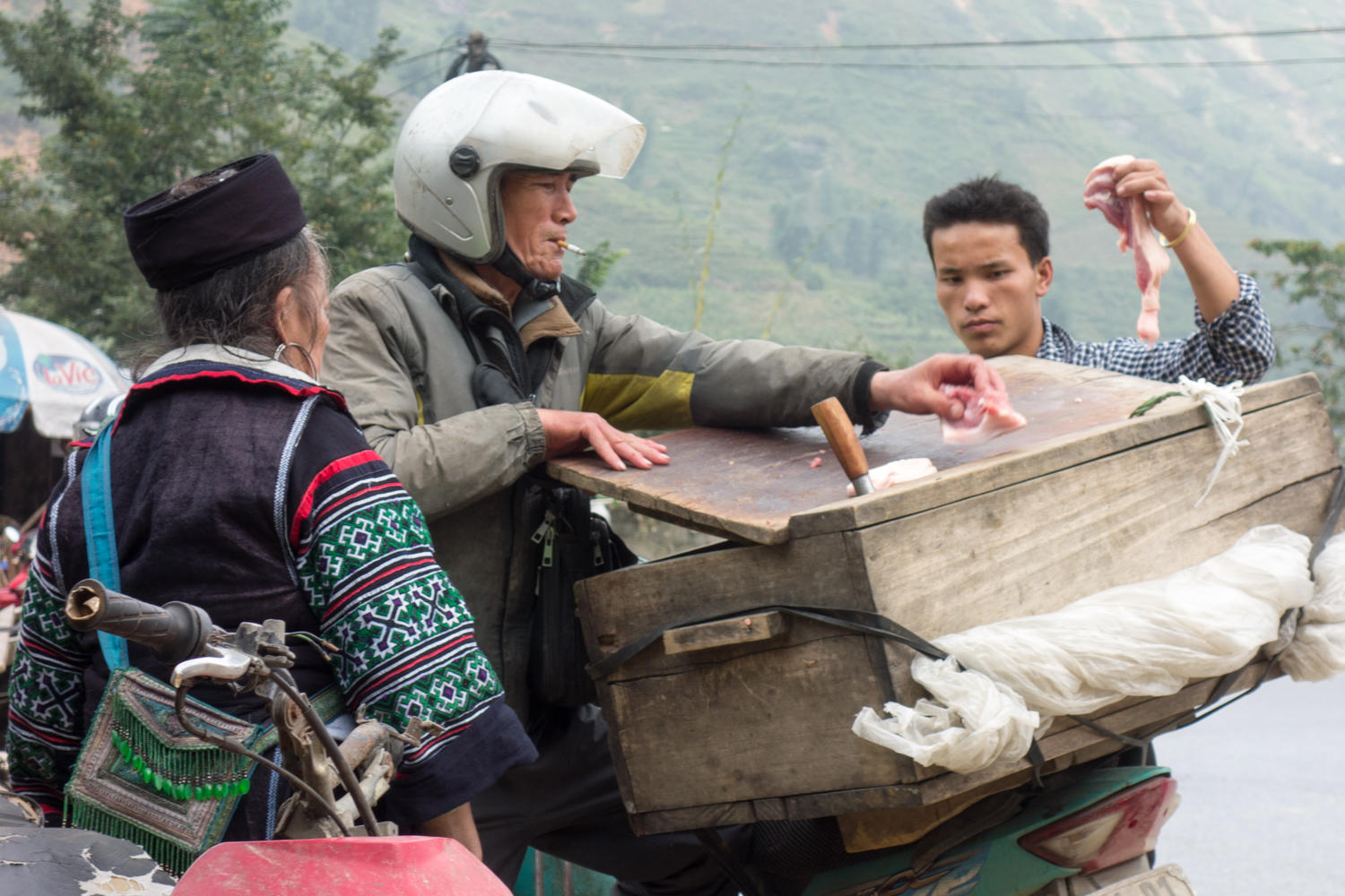 After the first 500 meters climb, we stop for a food break. This seems to be the one stop shopping place. A man with a box on the back of his motorcycle is selling meat. He reaches into the box, pulls out a chunk of meat and on the lid slices it up and places into a plastic bag. A woman rides up on a motorcycle with a big bucket resting between her legs. Lifting the heavy bucket, she carries it over to where there is a large silver tray and starts placing large blocks of tofu. In the corner of the store front, there is a mirror and chair for haircuts. And a few guys are working on their motorcycles, draining the oil or refilling the gas tank.