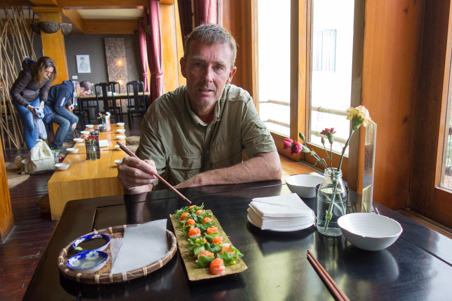 When we finally find the hotel we are quickly settled into our first floor room. A nice balcony, but no view because of the police station across the alley. It is relatively quiet though, and the room is huge. After a shower, we walk to the Hillstation Restaurant for spring rolls and a true northwestern style microbrew from "Pasteur Street Brewing Co" in Saigon. Very nice. We take a walk around town, past the lake and find the supermarket where the locals shop. There is another supermarket in the backpackers area, but the prices are very inflated. That seems to be an issue with all of Sapa. We found peanut butter, but no nutella. We have high hopes for finding nutella in Laos.