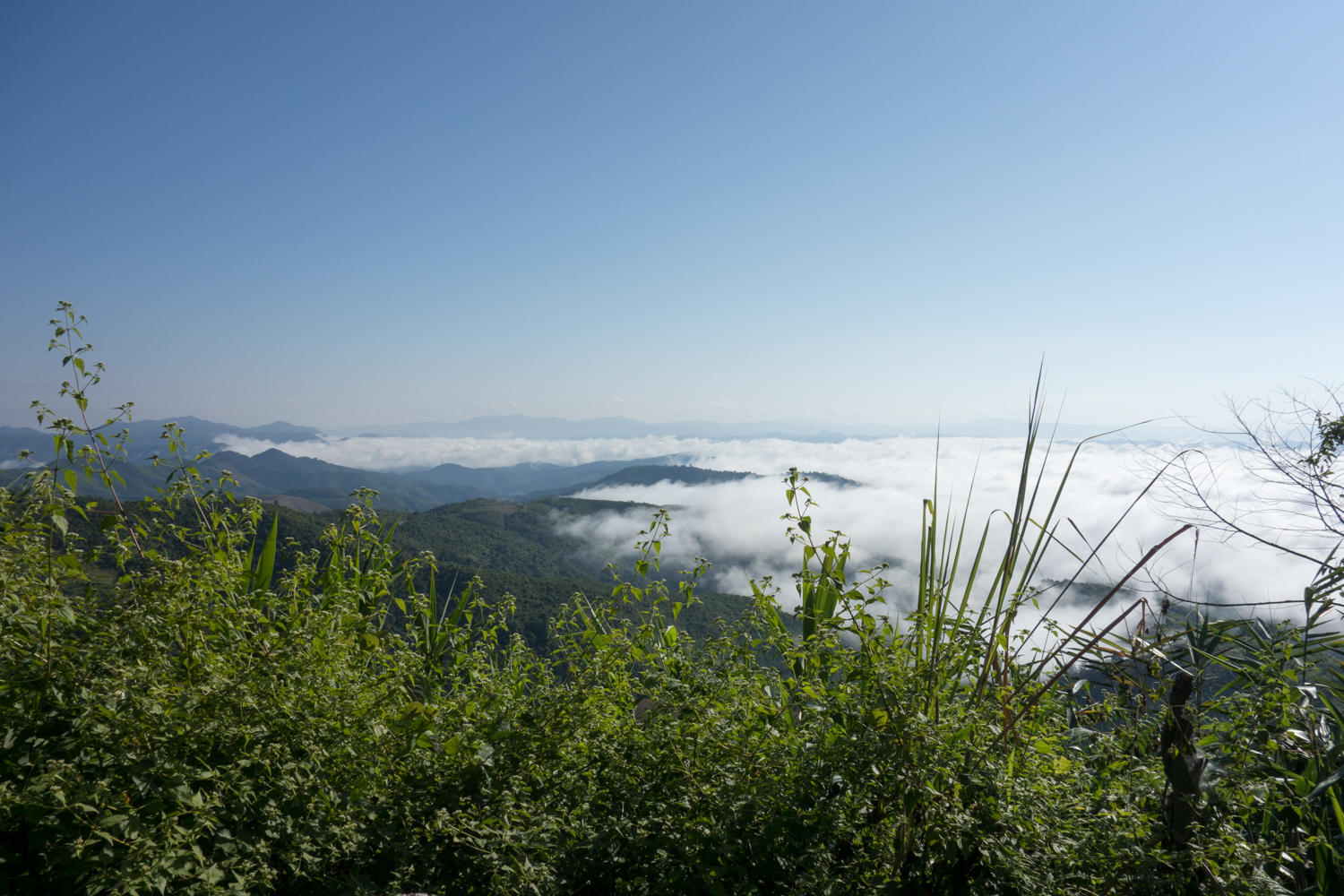 We started off very early in the morning mist. Once again looking to a long 600 meter climb and wanting to get to Muang Khua early. We make our way up slowly in increments of every couple of kilometer and elevation gain of 100-150 meters reaching the first summit at 1000 meters. Briefly we are above the clouds. Just below the summit, an English teacher on a motorcycle stops us just below the school. He invites us to talk to the students. We push our bikes up, only to find out there are no students today. So we push on. There is a bit of a false summit and a saddle to go through losing then regaining about a hundred meters back to 1000 meters.