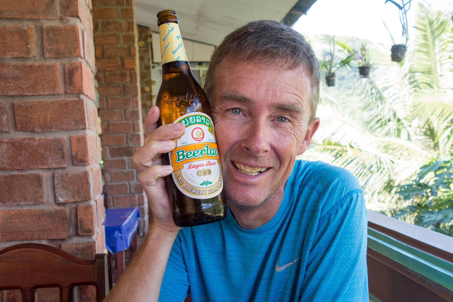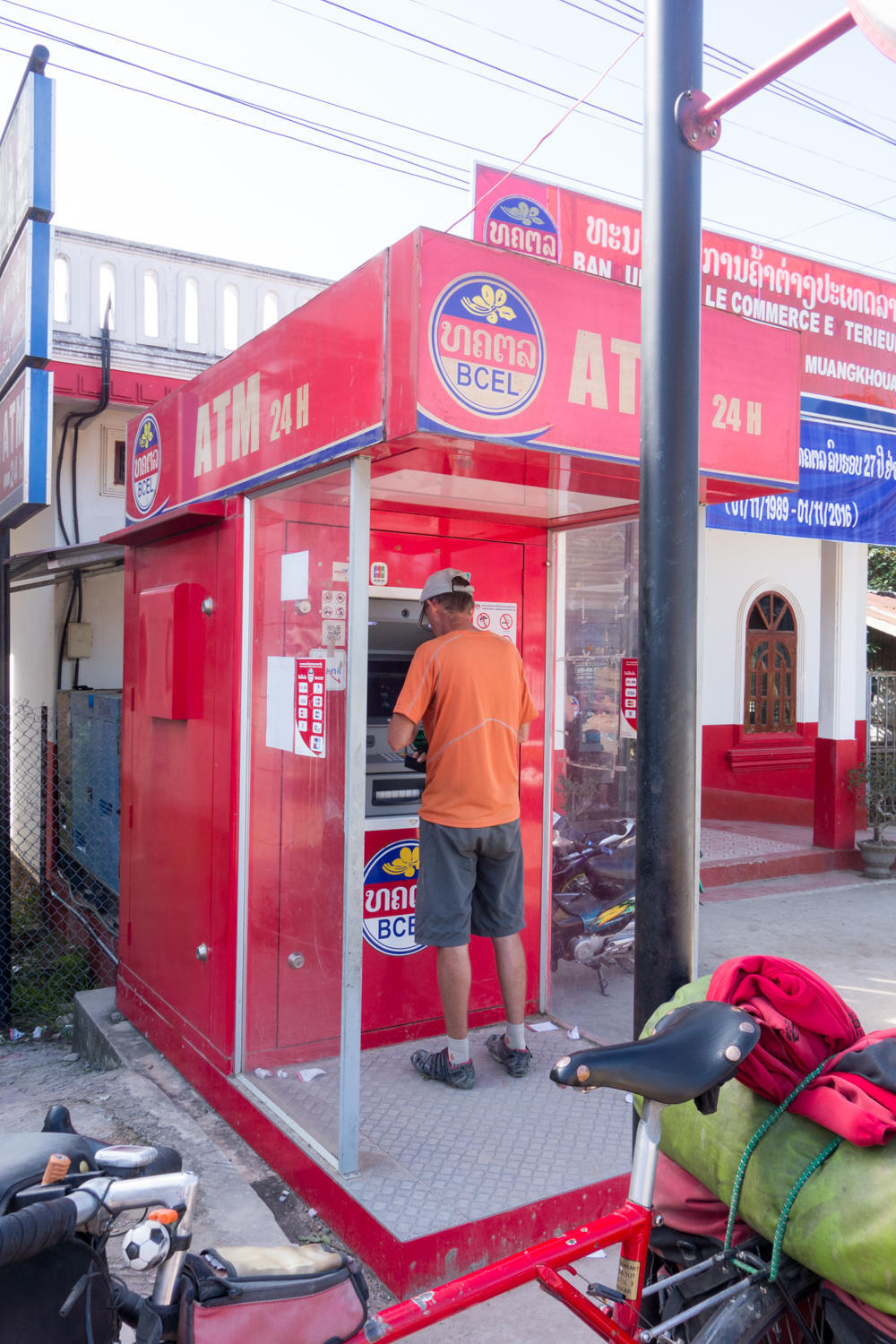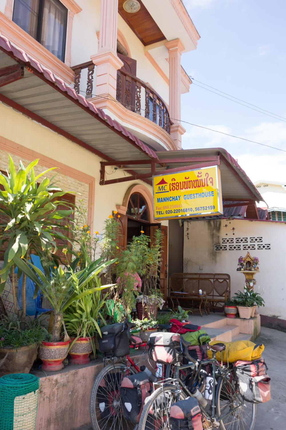 As we start the 10km descent, we again go through a misty fog. Visibility is poor and the downhill is chilly. Patrick stops at the 25,000km mark for this trip and puts on a jacket. The last 9km into town is undulating, crossing the river bridge we get to the main intersection of the town. There is an ATM that works this time. Continuing on the main road we check out first the fancy hotel on the right side. Then across the road the Manhchay Guesthouse. We take a room there, not as expensive at 80,000kkip ($10), nice room, friendly owner who makes room for our bikes in the lobby.